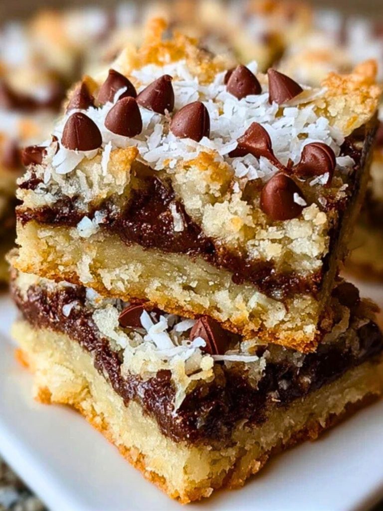Whether you’re making dessert for a family gathering or prepping a sweet snack for the week, these bars strike the perfect balance of textures and flavors. Every bite delivers a rich chocolate layer, a soft cookie base, and a tropical coconut crunch topped with semi-sweet chocolate chips.