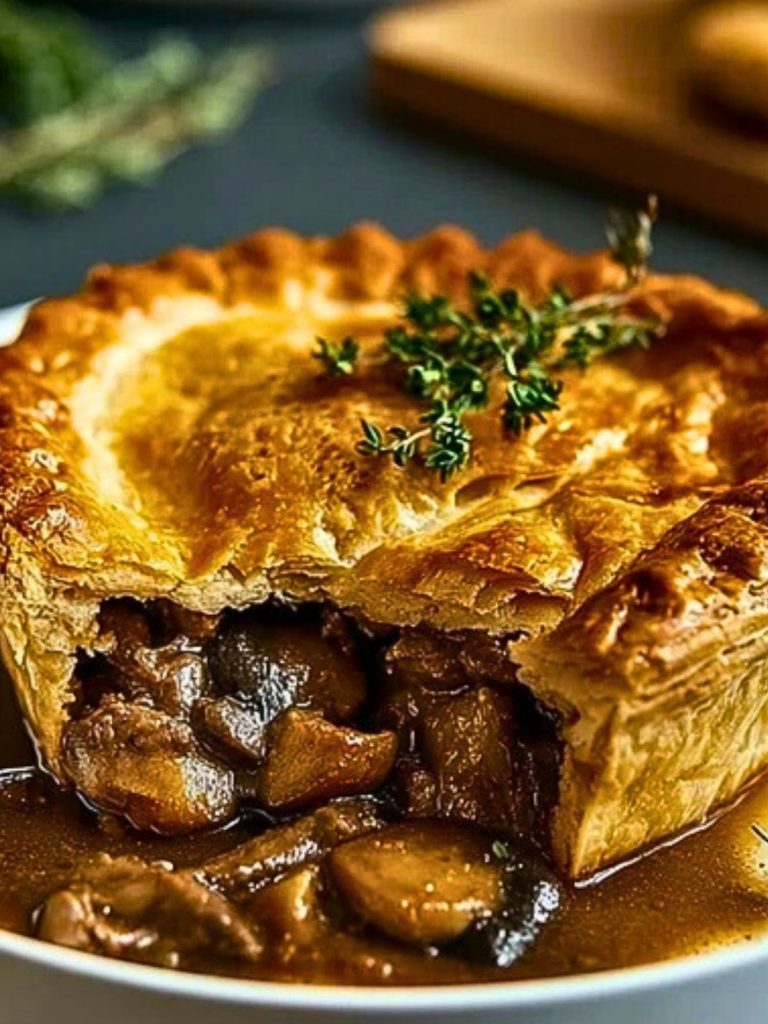 The luscious gravy thickens as it bakes, infusing the filling with even more depth. Pair it with creamy mashed potatoes or buttery peas and you’ve got a meal worth repeating. From its golden crust to its meaty, mushroom-packed center, this pie is comfort food royalty.