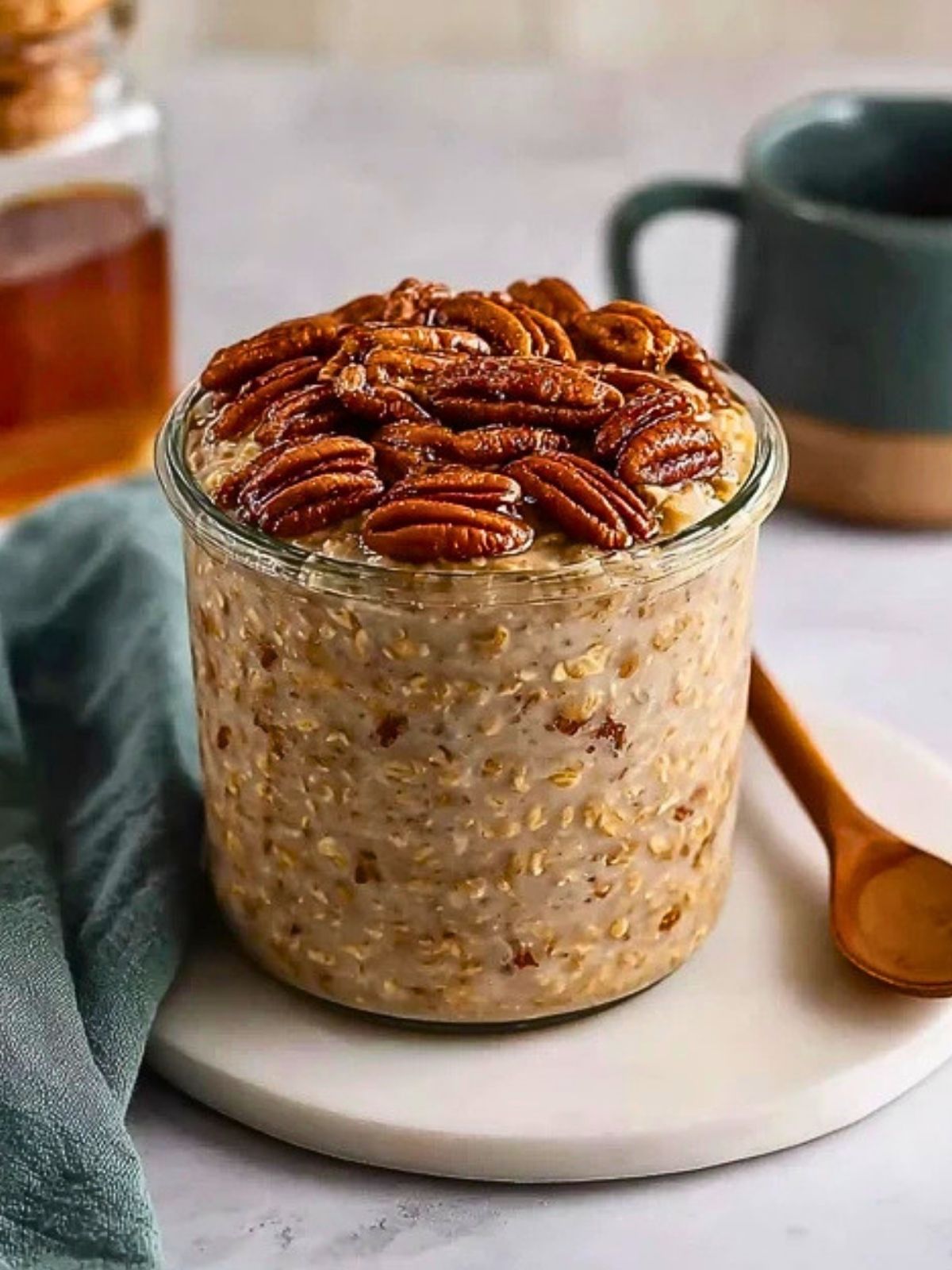 These overnight oats are easy, dependable, and packed with comforting flavor. The maple syrup gives them a natural sweetness, the cinnamon adds warmth, and the pecans create a rich nutty finish that keeps the texture from feeling flat.