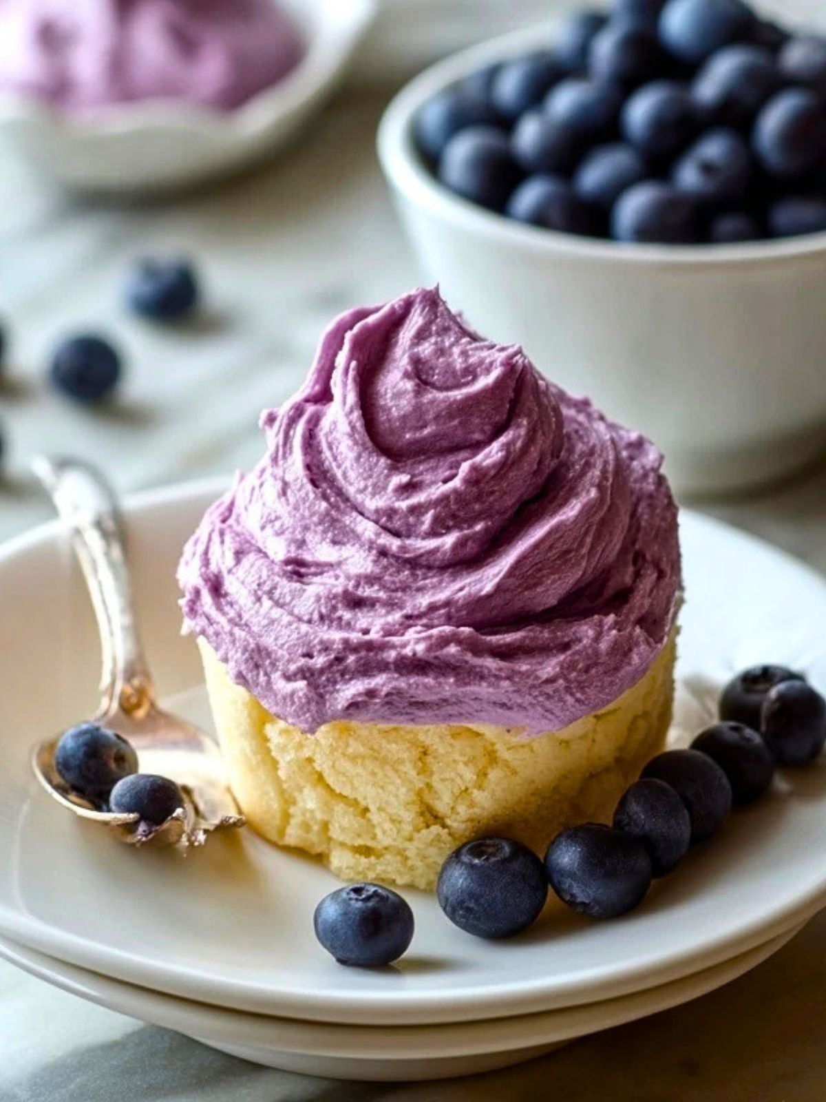 If the frosting feels too soft, chill it for 20 to 30 minutes before using. If it feels too thick, stir in a tiny amount of lemon juice or a spoonful of blueberry puree until it loosens slightly.