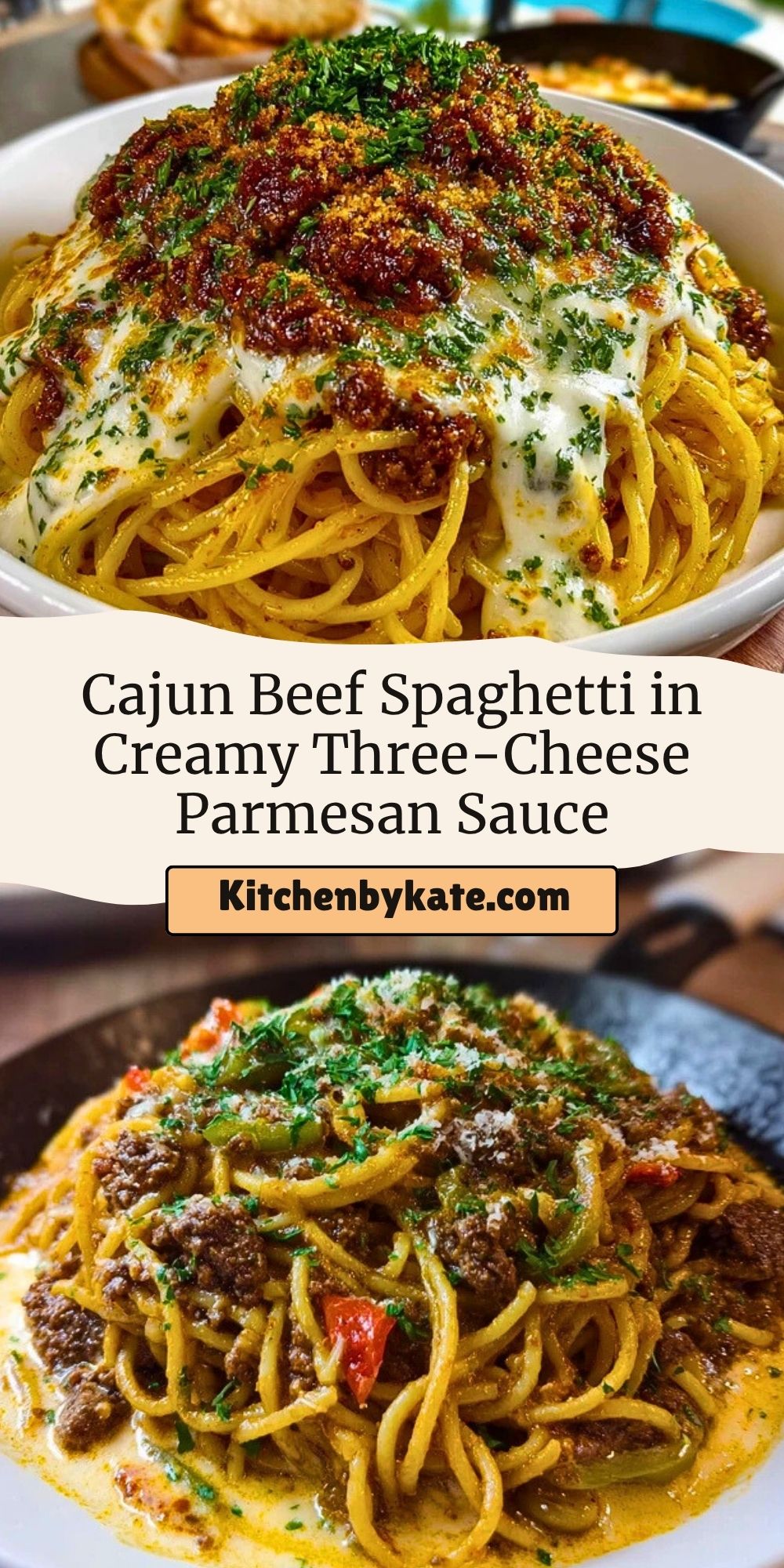 Cajun Beef Spaghetti in Creamy Three-Cheese Parmesan Sauce is the ultimate comfort pasta, combining tender spaghetti, seasoned beef, and a luscious blend of Parmesan, mozzarella, and cheddar in a rich cream sauce. Perfect for weeknight dinners or entertaining, this cheesy Cajun pasta brings bold flavor and creamy indulgence to your table.