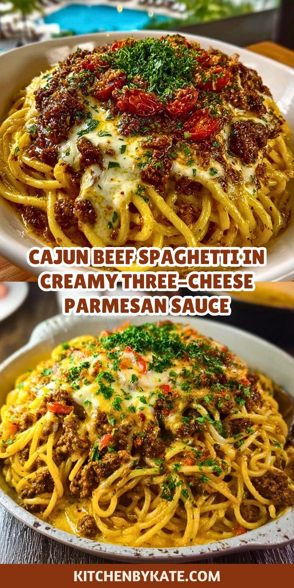 Rich, bold, and irresistibly creamy — this Cajun Beef Spaghetti in Creamy Three-Cheese Parmesan Sauce is comfort food turned gourmet. Imagine a mountain of perfectly cooked pasta coated in a velvety blend of Parmesan, mozzarella, and cheddar, all crowned with savory Cajun-spiced beef and sprinkled with fresh herbs. Each bite is a balance of heat, creaminess, and hearty flavor that feels like a warm hug on a plate.