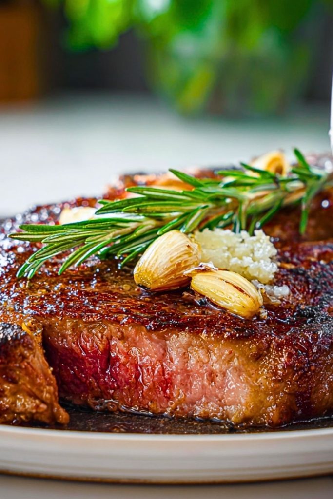 Reduce the heat to medium. Add butter, smashed garlic, and fresh rosemary or thyme. Tilt the pan and baste the steak continuously with the melted butter for another 1–2 minutes.