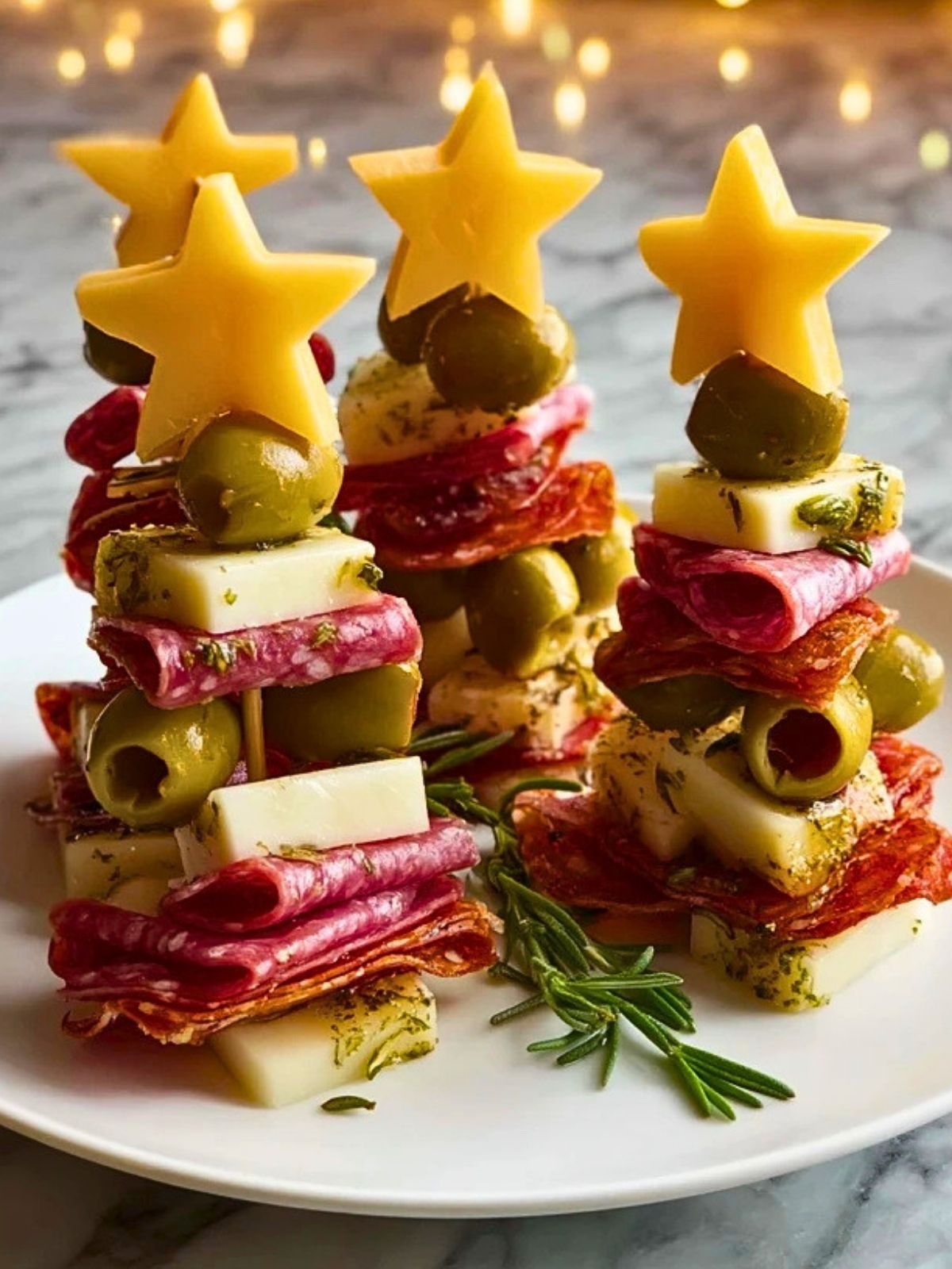 These Charcuterie Tree Skewers Party bites turn a simple appetizer board into something festive, playful, and easy to grab. Each skewer stacks olives, cured meats, and cubes of cheese into a cute holiday tree shape, then finishes with a star topper that makes the whole platter feel extra special.