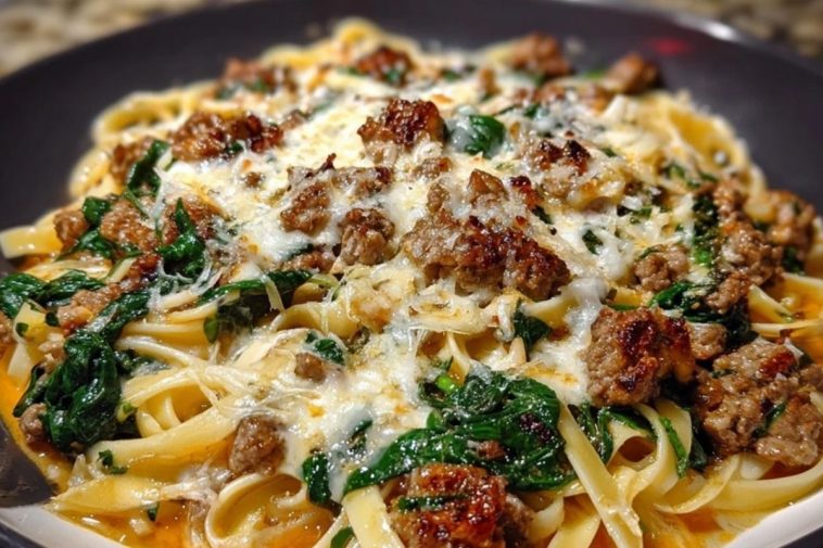 Why You’ll Love This Cheesy Garlic Butter Linguine with Beef, Sausage and Spinach