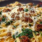 Cheesy Garlic Butter Linguine with Beef, Sausage and Spinach