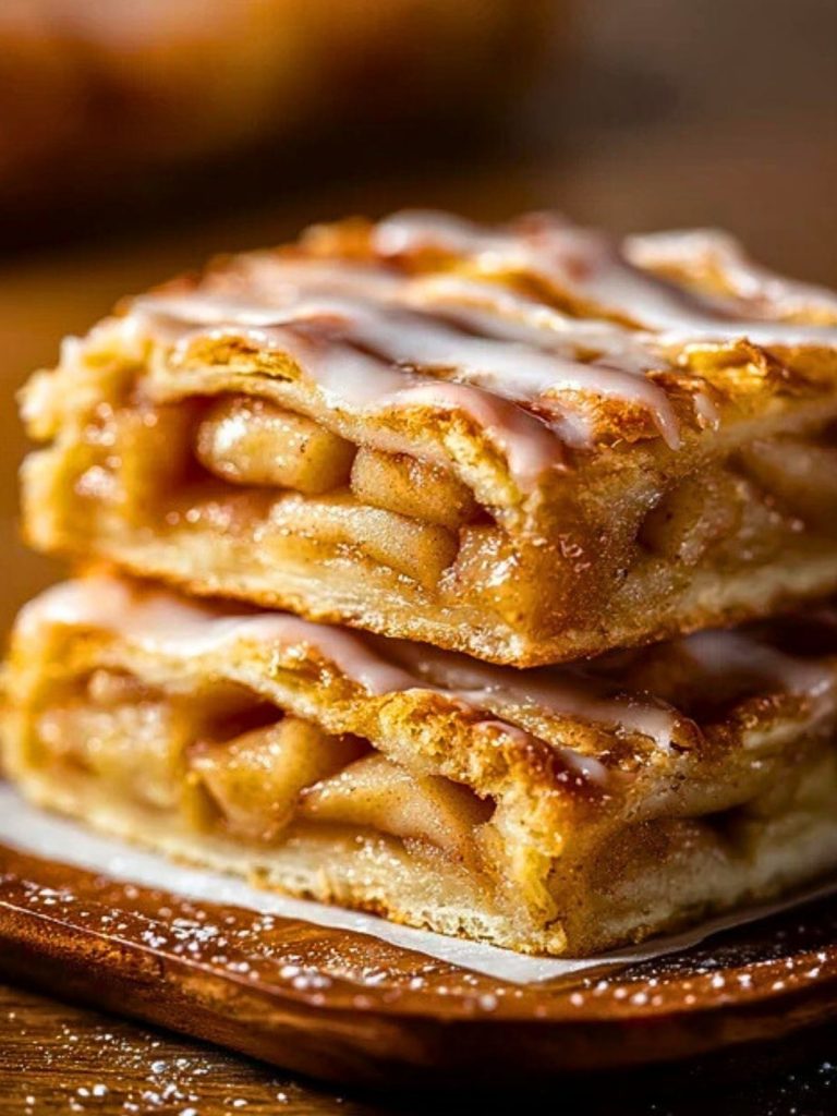 Baked in a sheet pan and sliced into generous squares, these slices are ideal for feeding a crowd. The pastry is buttery and crisp, while the apple filling is rich with warm spices and just enough sweetness. Topped with a simple powdered sugar glaze, each bite melts in your mouth, making it a go-to for fall gatherings or holiday parties.