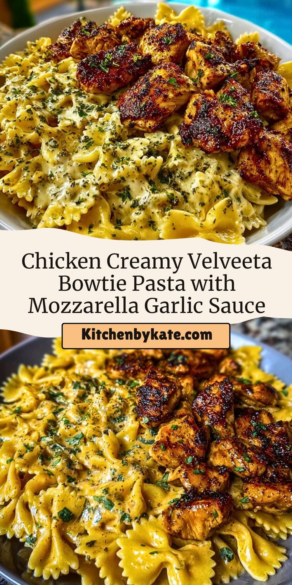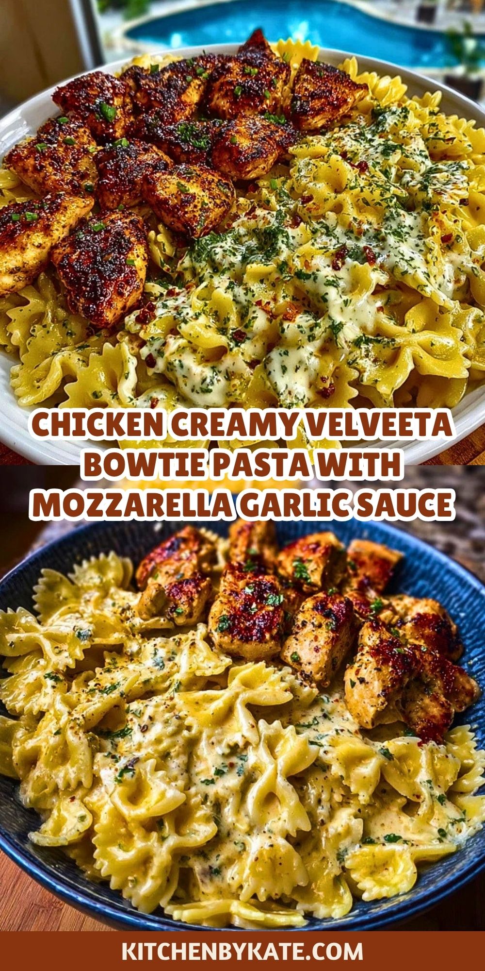 Creamy Chicken Velveeta Bowtie Pasta with Mozzarella Garlic Sauce—juicy seared chicken, farfalle, and a silky garlic cream sauce melted with Velveeta and mozzarella. Perfect weeknight comfort.