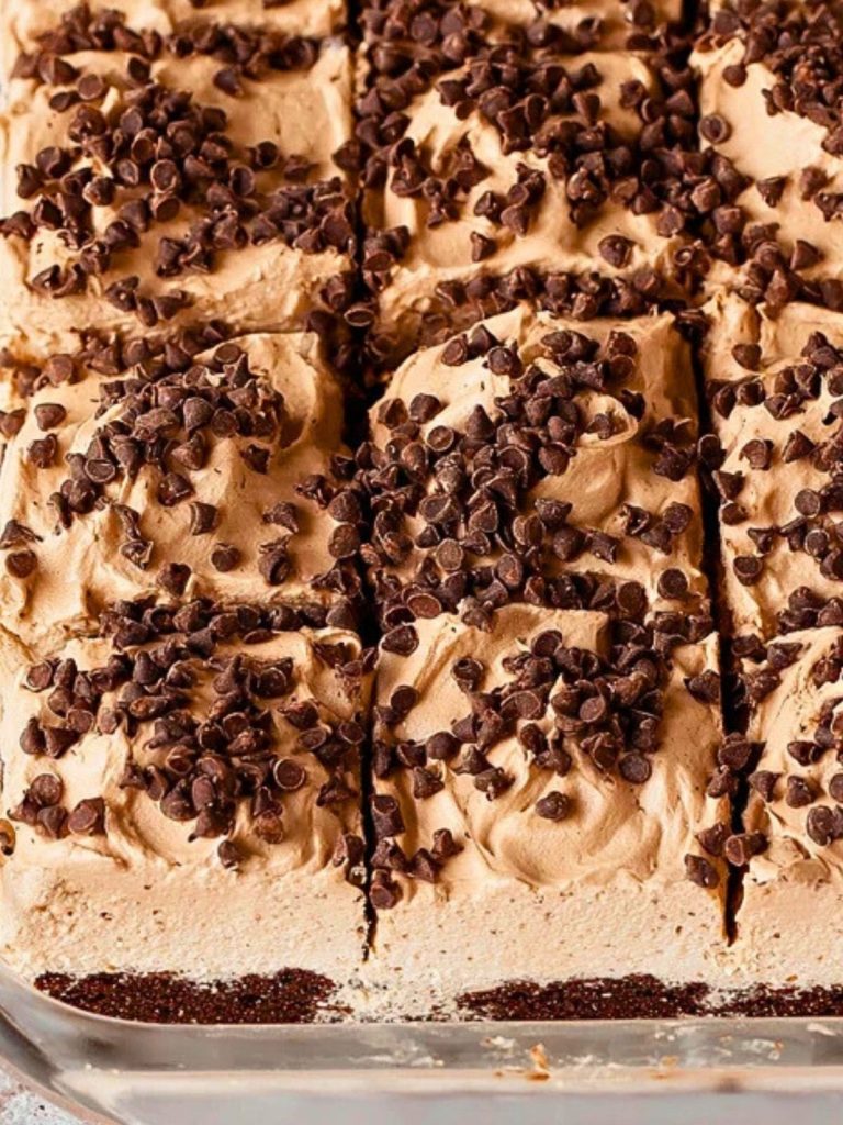 Perfect for celebrations or potlucks, this cake is not only delicious but also a showstopper in presentation. It looks as luxurious as it tastes, with its cloud-like topping and the glossy sheen of chocolate chips scattered generously across the top. Plus, it’s a make-ahead dessert that actually gets better as it chills overnight—what’s not to love?