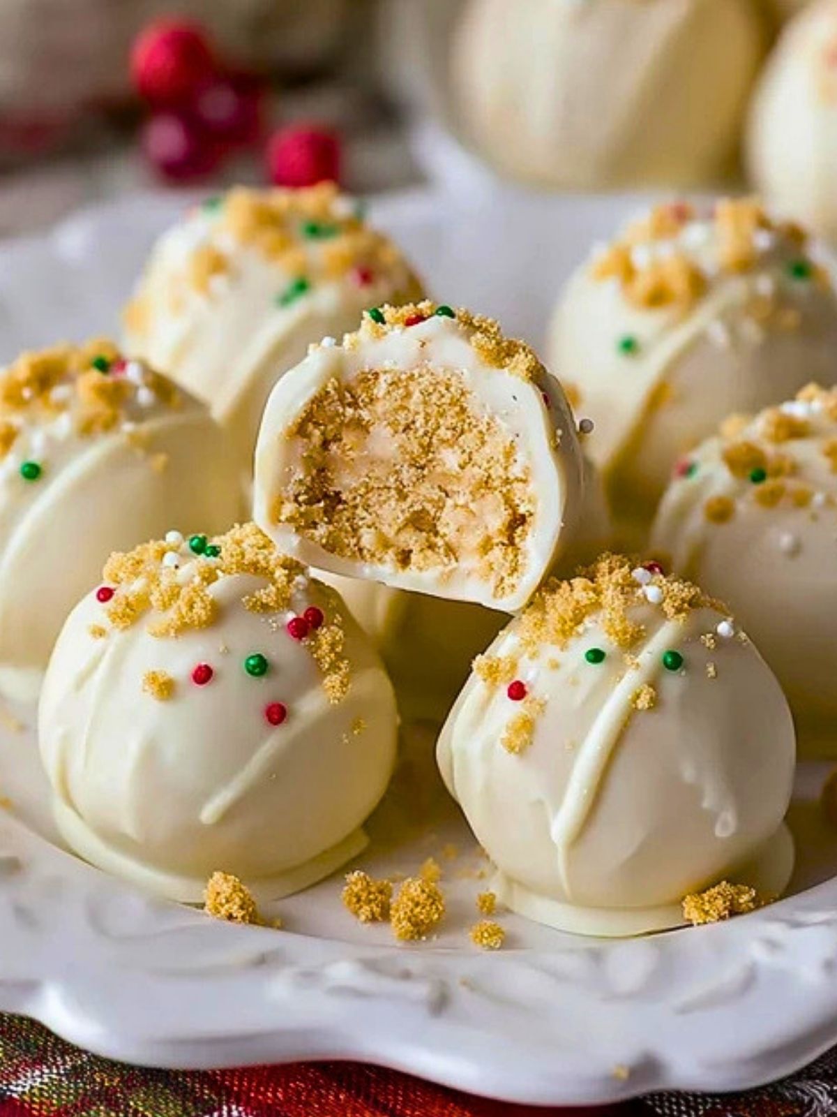 These truffles are wonderfully simple but still look elegant enough for cookie exchanges, holiday trays, and family gatherings. The filling is smooth and sweet with that familiar vanilla cookie flavor, while the white chocolate coating adds a creamy finish that makes every bite feel extra festive.