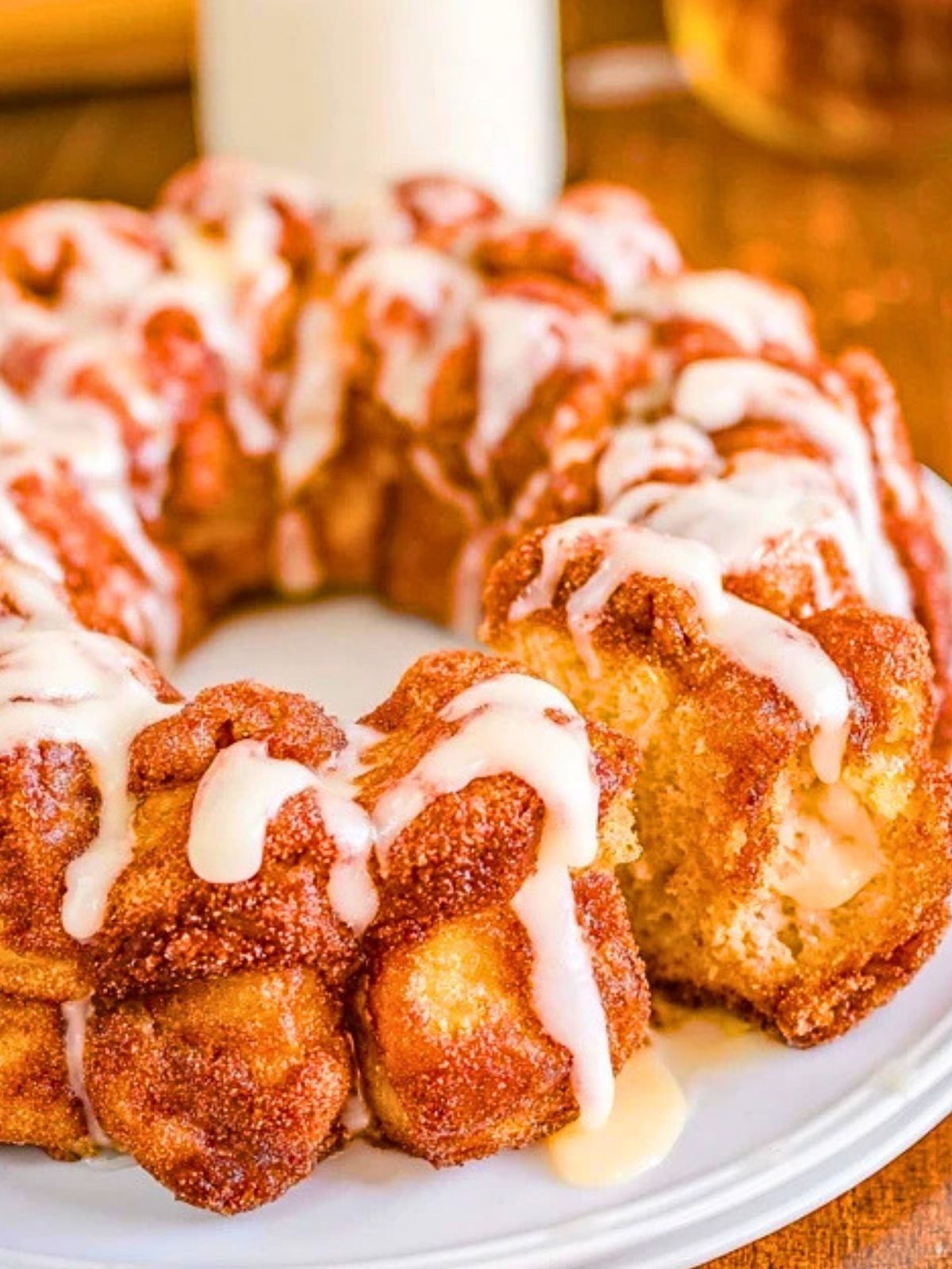 Beat the cream cheese until smooth, then mix in the powdered sugar, milk, and vanilla extract until creamy and pourable. Drizzle it generously over the warm monkey bread.