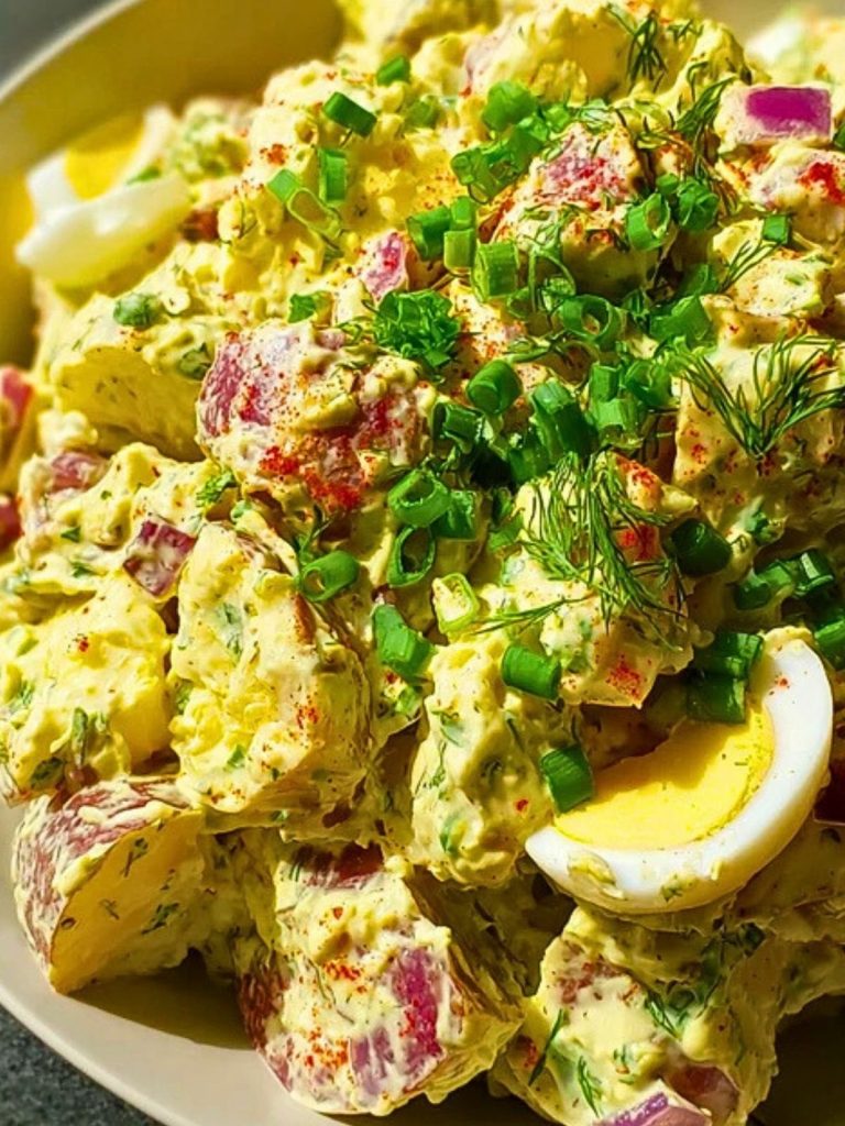 Chunks of tender red potatoes are tossed in a rich dressing made from mayonnaise, mustard, chopped dill pickles, and fresh herbs. Red onions and celery add crunch, while chopped boiled eggs bring a savory richness. It’s perfectly chilled and seasoned, making it an irresistible side that vanishes fast!