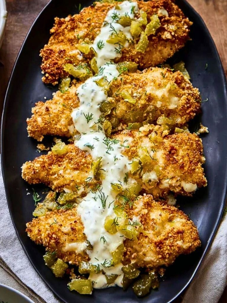 Drizzle sauce over hot, crispy chicken and top with extra chopped pickles and fresh dill. Serve immediately for peak crunch.