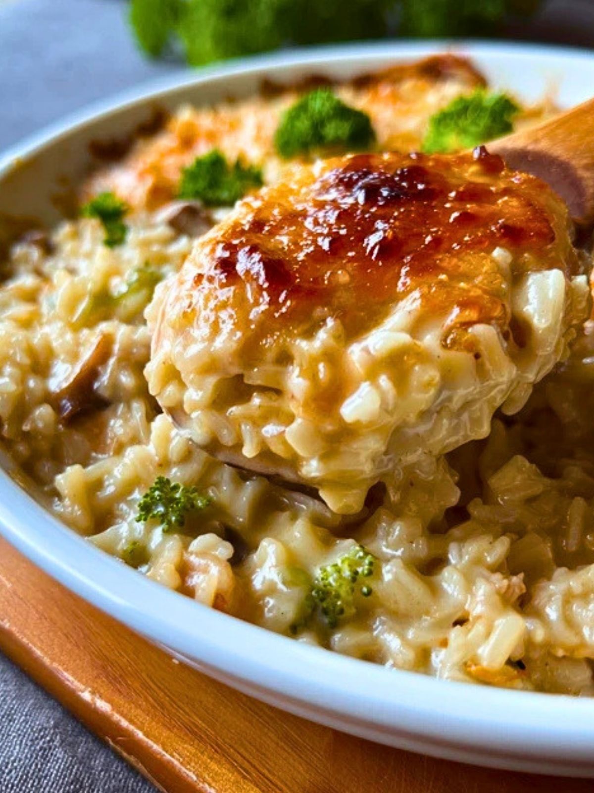 No need to pre-cook anything—just mix, bake, and serve. The rice soaks up all the creamy goodness as it cooks, and the golden cheese topping adds that irresistible finish. It’s a low-effort dinner that tastes like you spent all day in the kitchen.