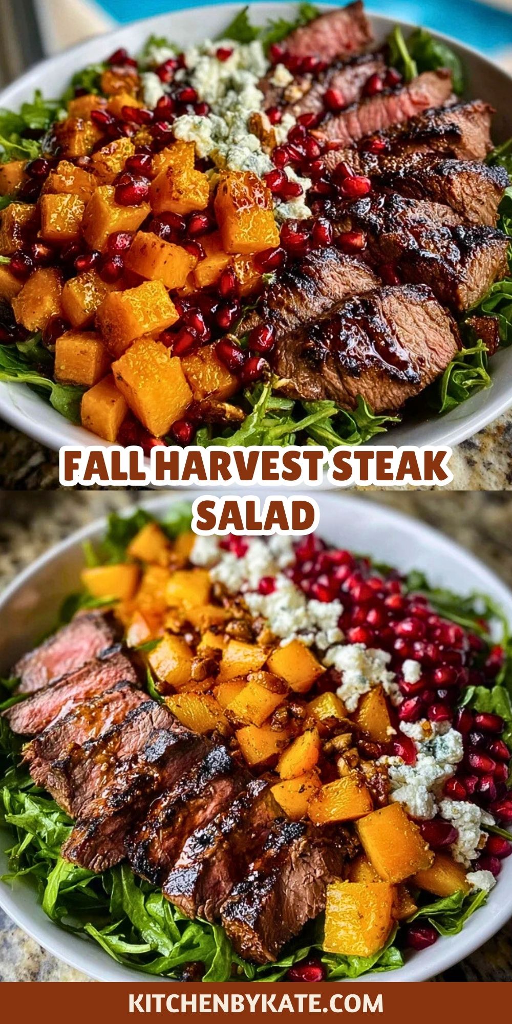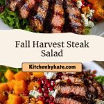 This Fall Harvest Steak Salad recipe is a hearty and vibrant autumn meal, made with seared steak, roasted butternut squash, pomegranate seeds, and blue cheese over fresh greens. Perfect for a nutritious fall lunch or dinner, this seasonal salad delivers the perfect blend of flavors and textures.