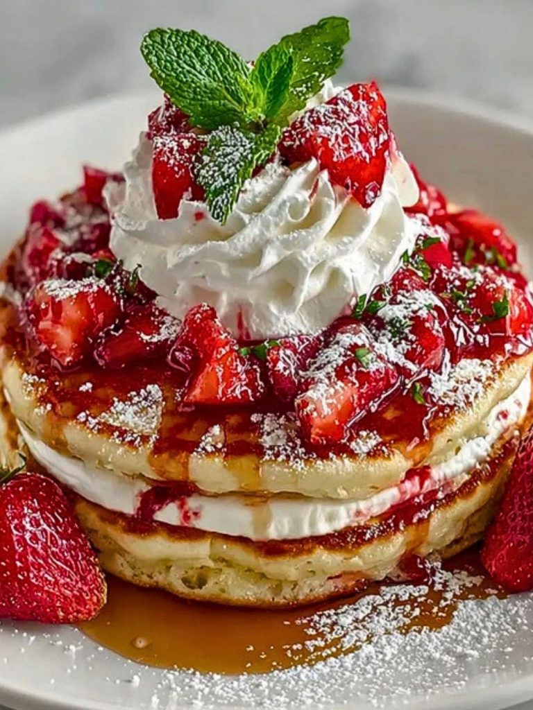 Fluffy Strawberry Cheesecake Pancakes are like breakfast and dessert all in one decadent stack. Imagine buttery, soft pancakes layered with a tangy cream cheese filling and topped with syrupy strawberries, a swirl of whipped cream, and a minty pop of freshness. Whether it’s a weekend brunch or a special treat, this dish is an absolute showstopper that’s easier to make than it looks.