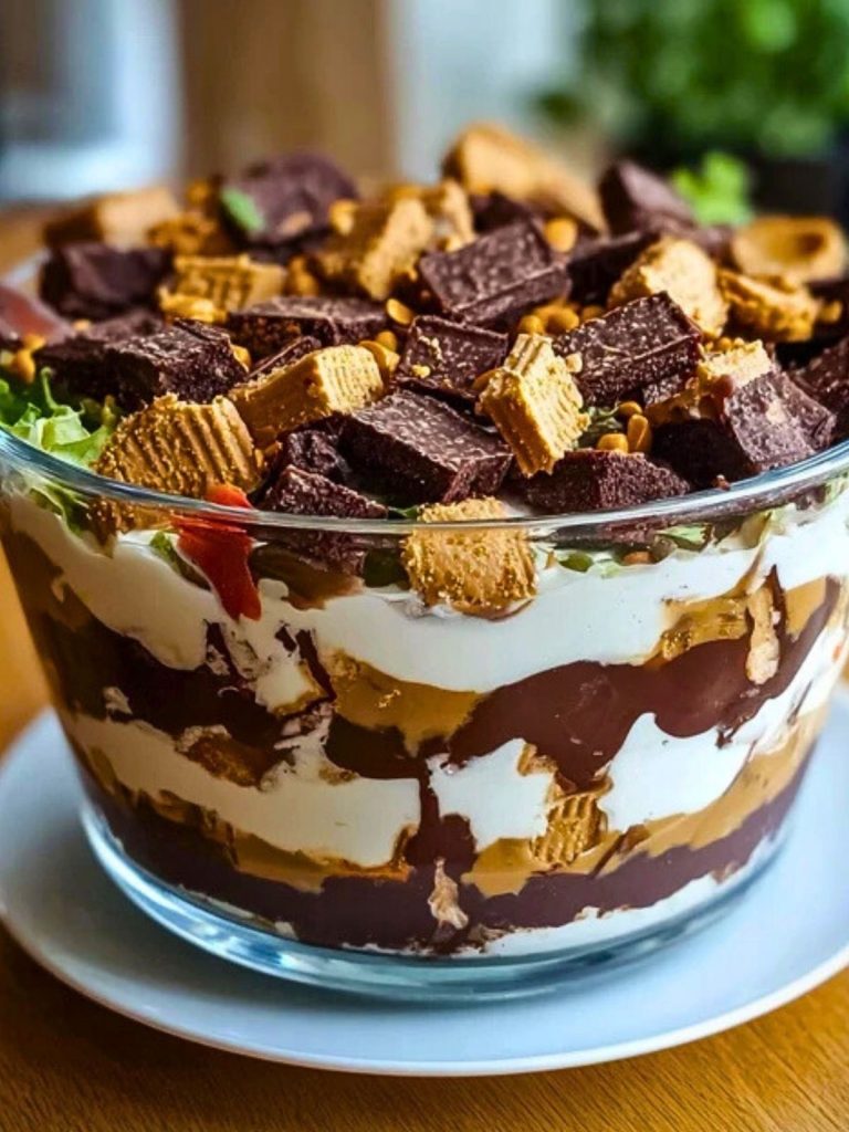 - Reese’s Peanut Butter Cups – Chopped and layered throughout for candy-bar crunch.