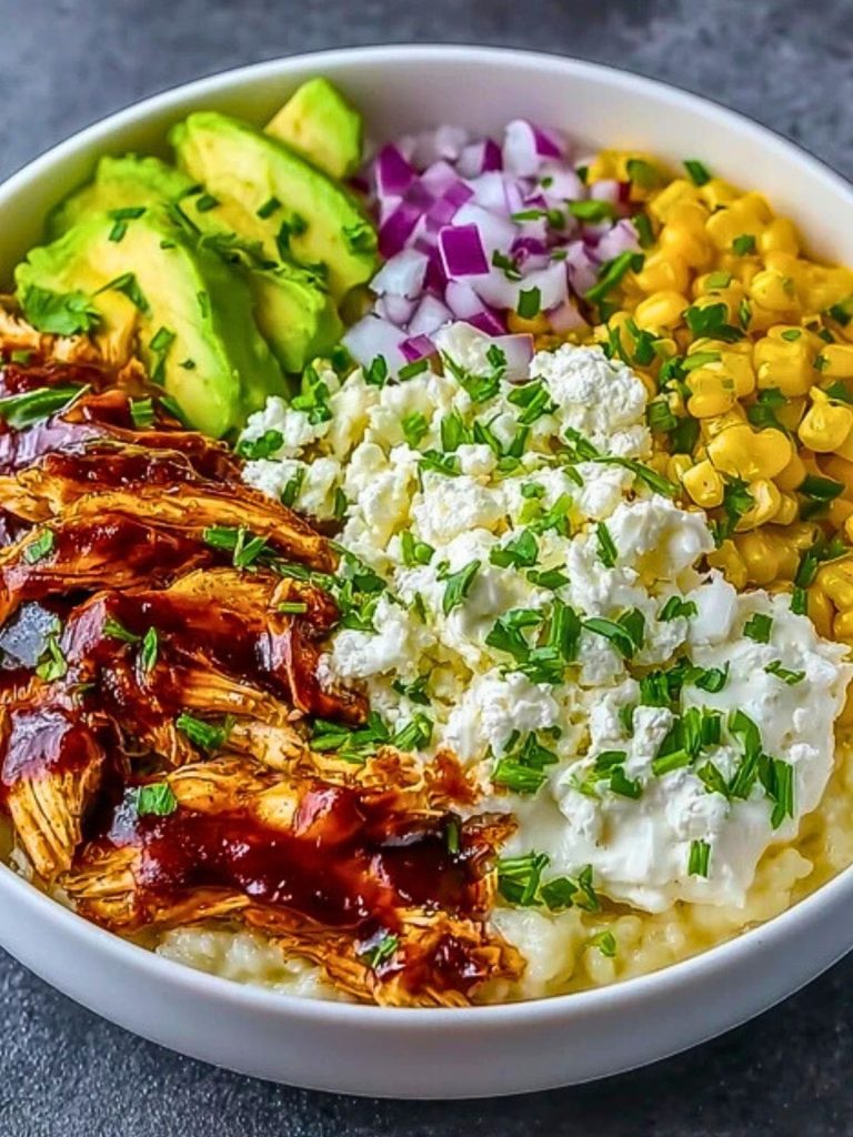 If you’re in the mood for a meal that tastes indulgent but fuels your body with nutritious goodness, this High Protein BBQ Chicken Cottage Cheese Bowl hits the mark. Creamy mashed potatoes form a hearty base, topped with tender shredded BBQ chicken, creamy cottage cheese, crisp corn, avocado slices, red onion, and crumbles of tangy feta. Each bite is a satisfying blend of textures and bold flavors, balancing comfort with clean eating.