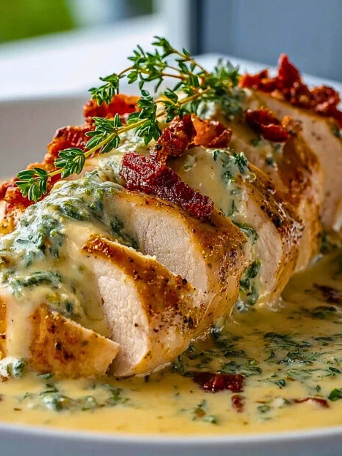 8. Garnish with crispy bacon and fresh thyme before serving.