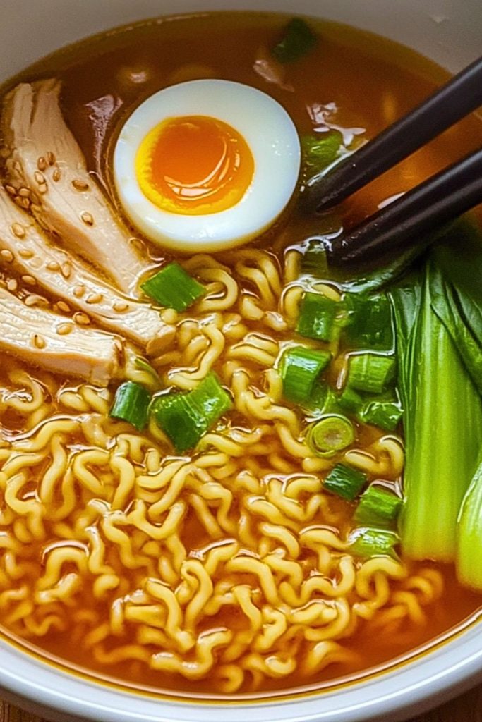A warm and comforting noodle soup layered with savory broth, tender chicken, crisp bok choy, and topped with a jammy soft-boiled egg. This Homemade Chicken Ramen Soup is a weeknight favorite and easy to make with pantry ingredients.