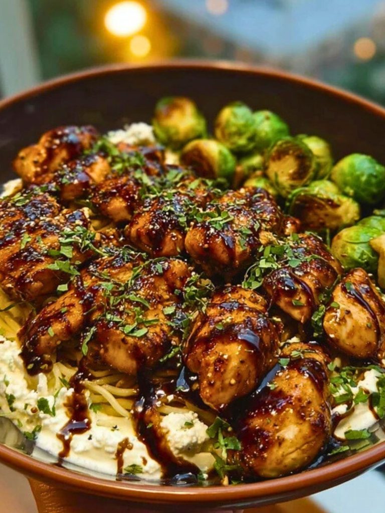 In a bowl, layer Alfredo pasta, top with glazed chicken, dollops of whipped feta, and a handful of crispy Brussels chips. Drizzle extra balsamic glaze if desired.