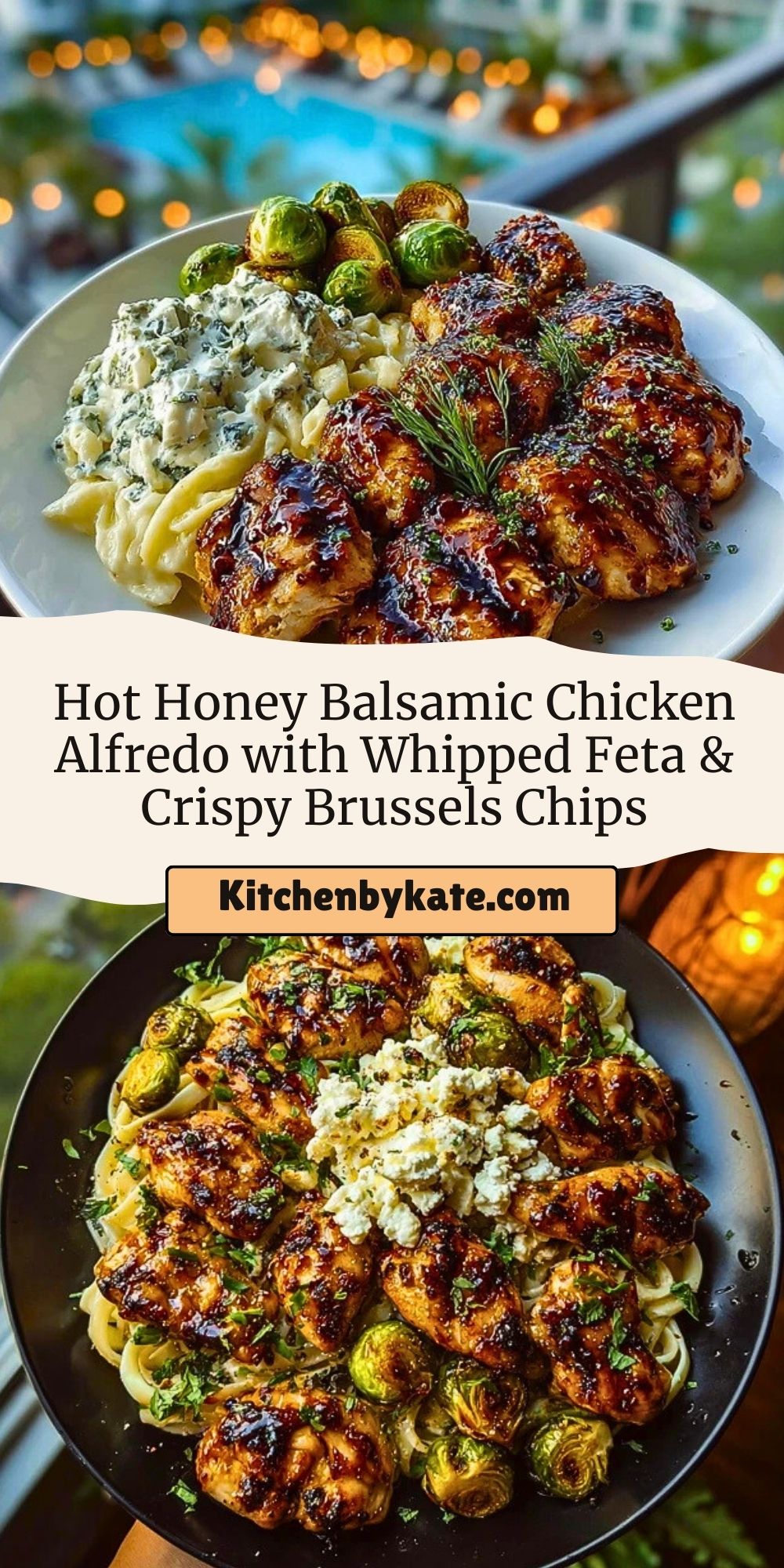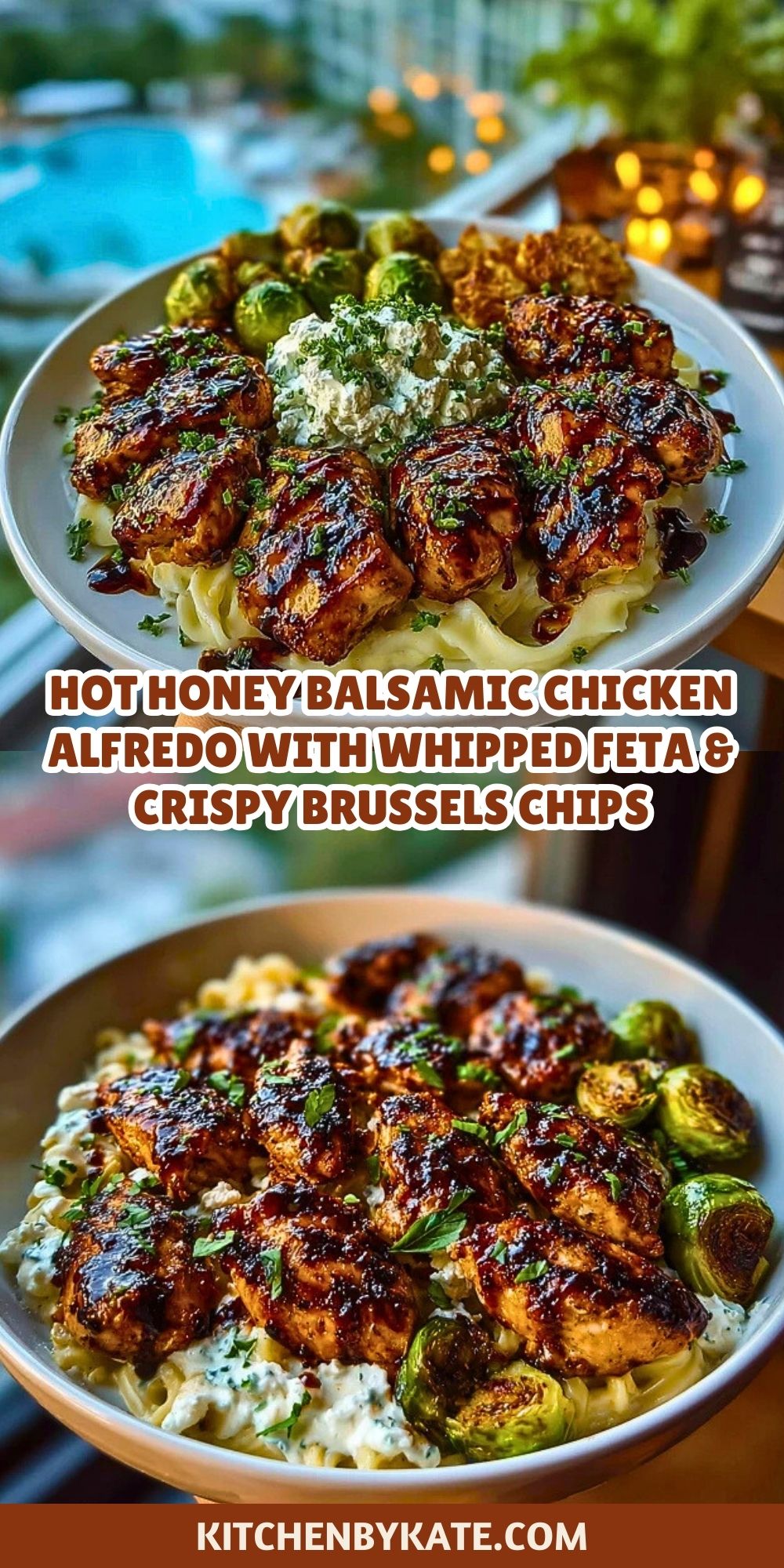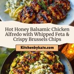 This Hot Honey Balsamic Chicken Alfredo with Whipped Feta & Crispy Brussels Chips is a creamy, bold chicken pasta recipe combining spicy hot honey glazed chicken, tangy whipped feta, rich Alfredo sauce, and crispy Brussels sprouts. A gourmet weeknight meal packed with flavor and texture.