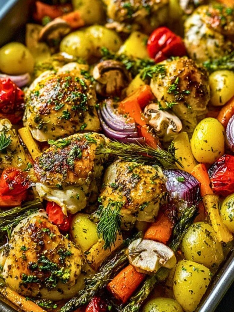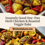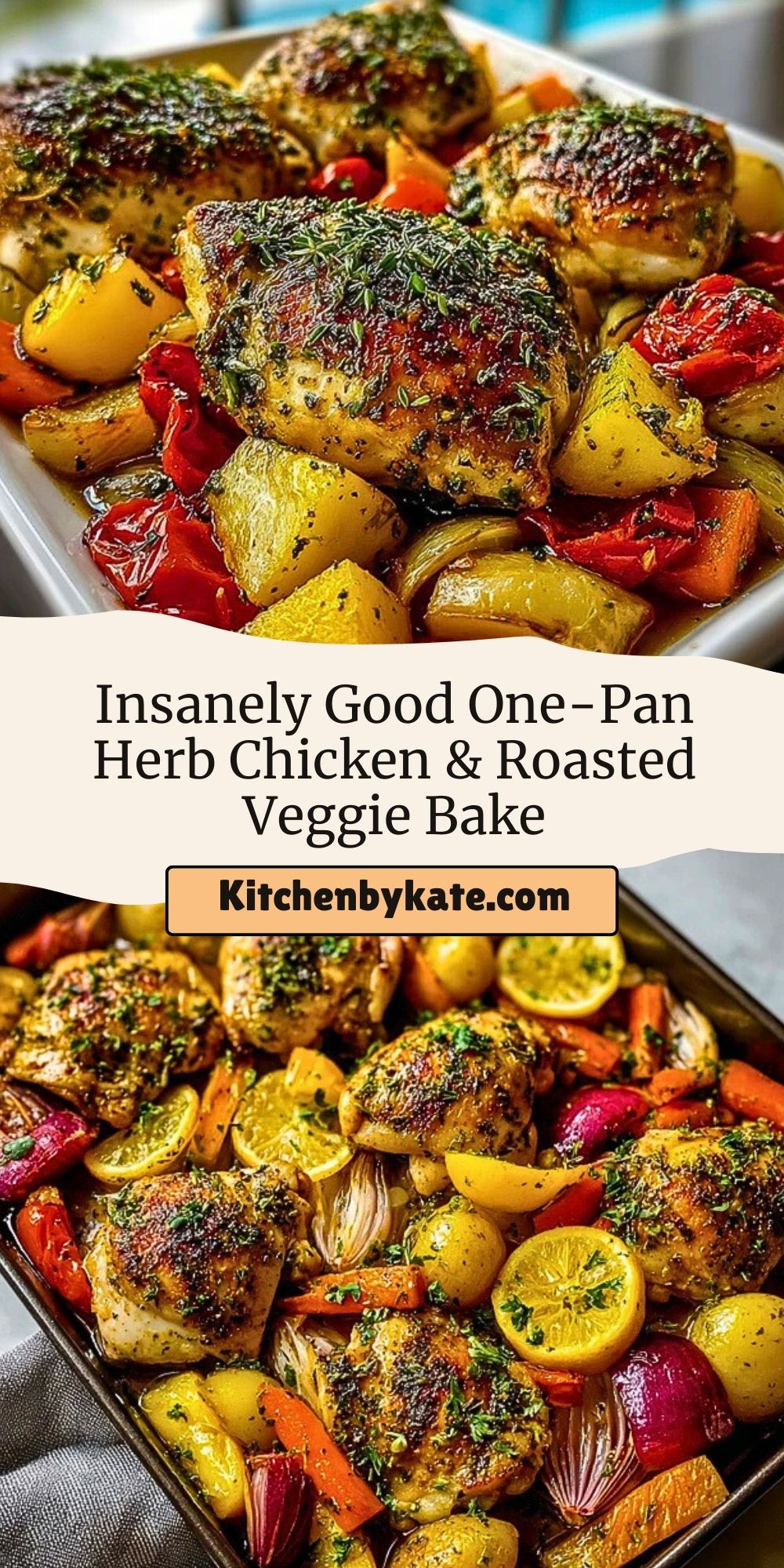This one-pan herb chicken and roasted veggie bake is the ultimate easy dinner recipe. Featuring juicy herb-seasoned chicken thighs, crispy potatoes, roasted bell peppers, zucchini, and red onions, it’s a delicious sheet pan meal that’s perfect for busy weeknights or meal prep. A healthy and flavorful chicken dinner recipe you’ll want to save and repeat!
