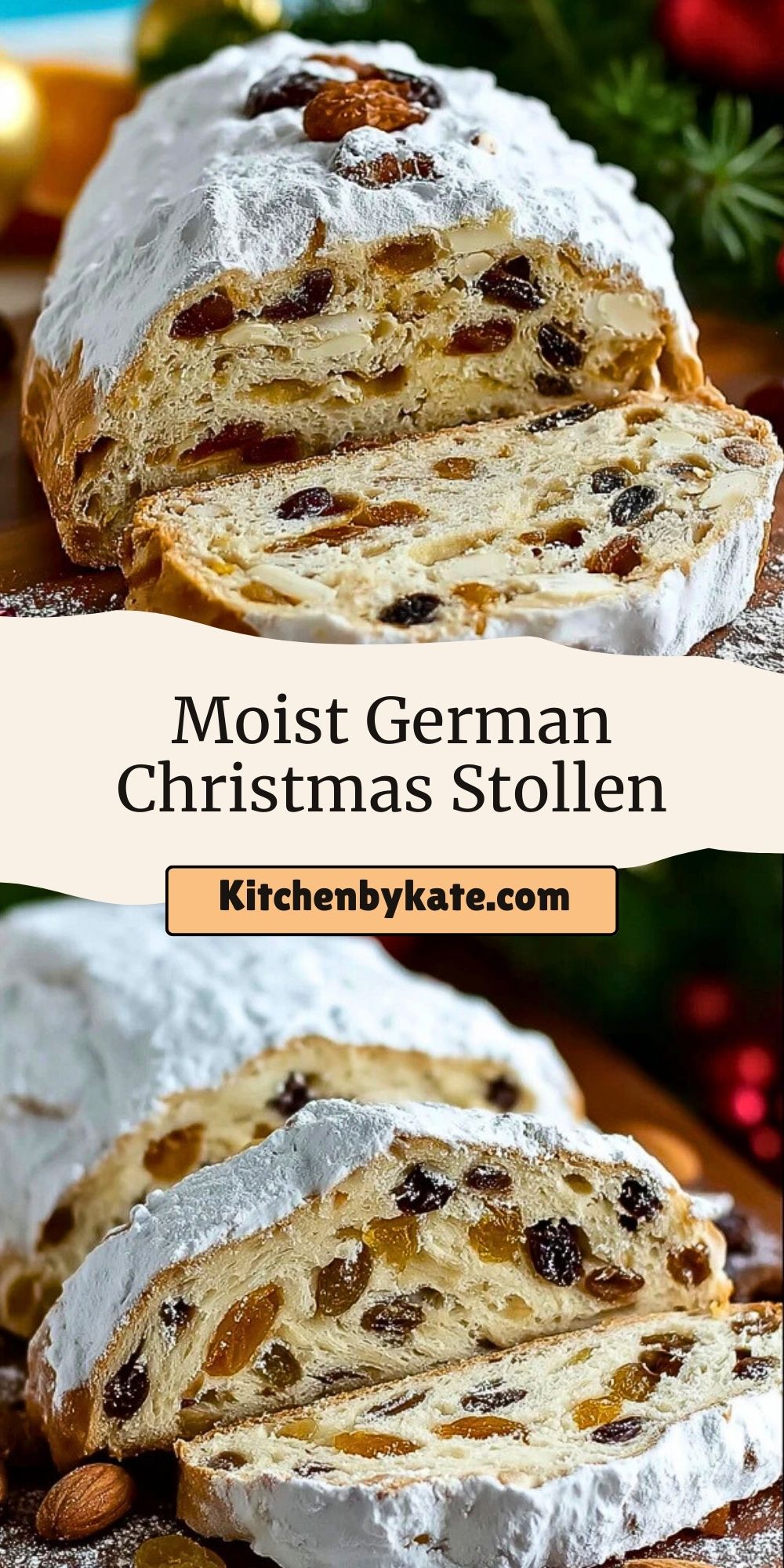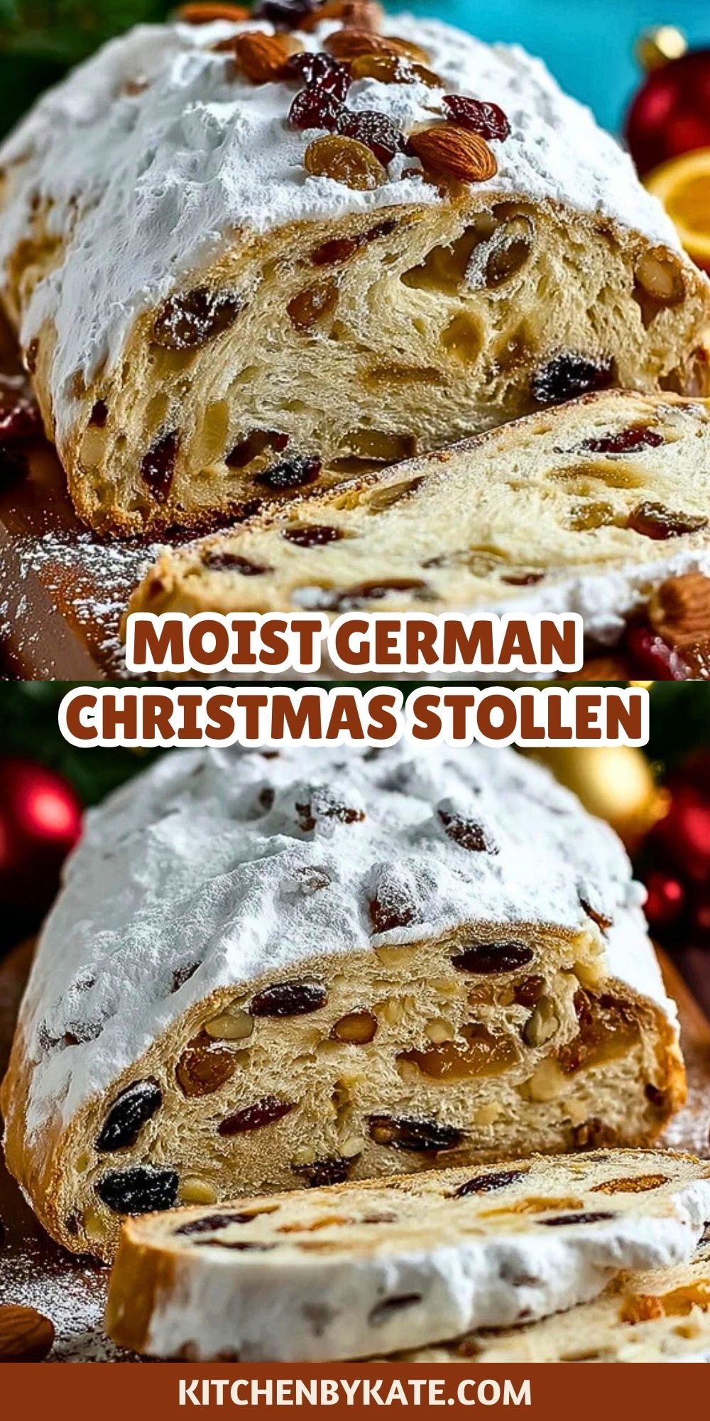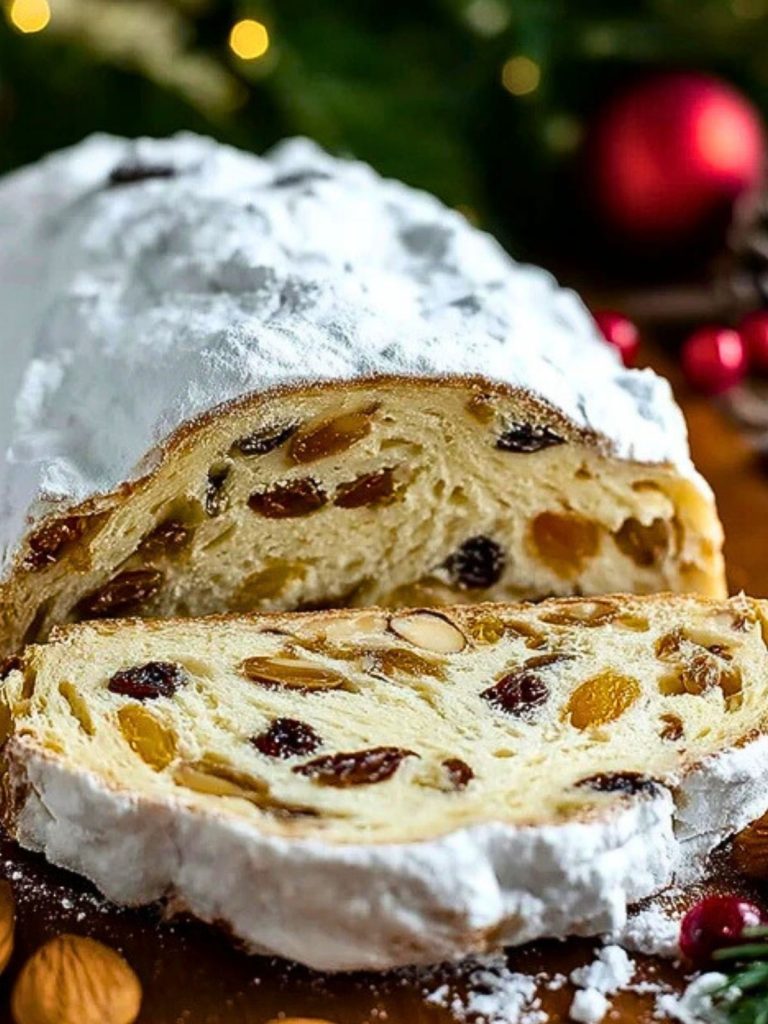A holiday treasure steeped in centuries of tradition, Moist German Christmas Stollen is more than just a festive bread—it’s a beloved centerpiece of any Christmas table. Dusted generously with powdered sugar and packed with golden raisins, candied citrus, and toasty almonds, this rich, buttery loaf has a dense yet tender crumb that only improves with time. Whether served with morning coffee or gifted in a ribbon-wrapped package, this stollen evokes the cozy charm of German Christmas markets and family kitchens filled with spice and joy.