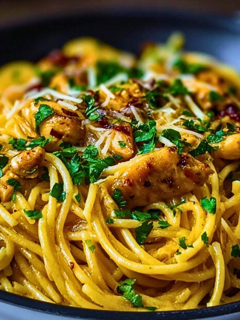 Add the cooked chicken back to the sauce, followed by the drained spaghetti. Toss well to coat. Add pasta water a bit at a time if the sauce needs thinning. Garnish with herbs before serving.