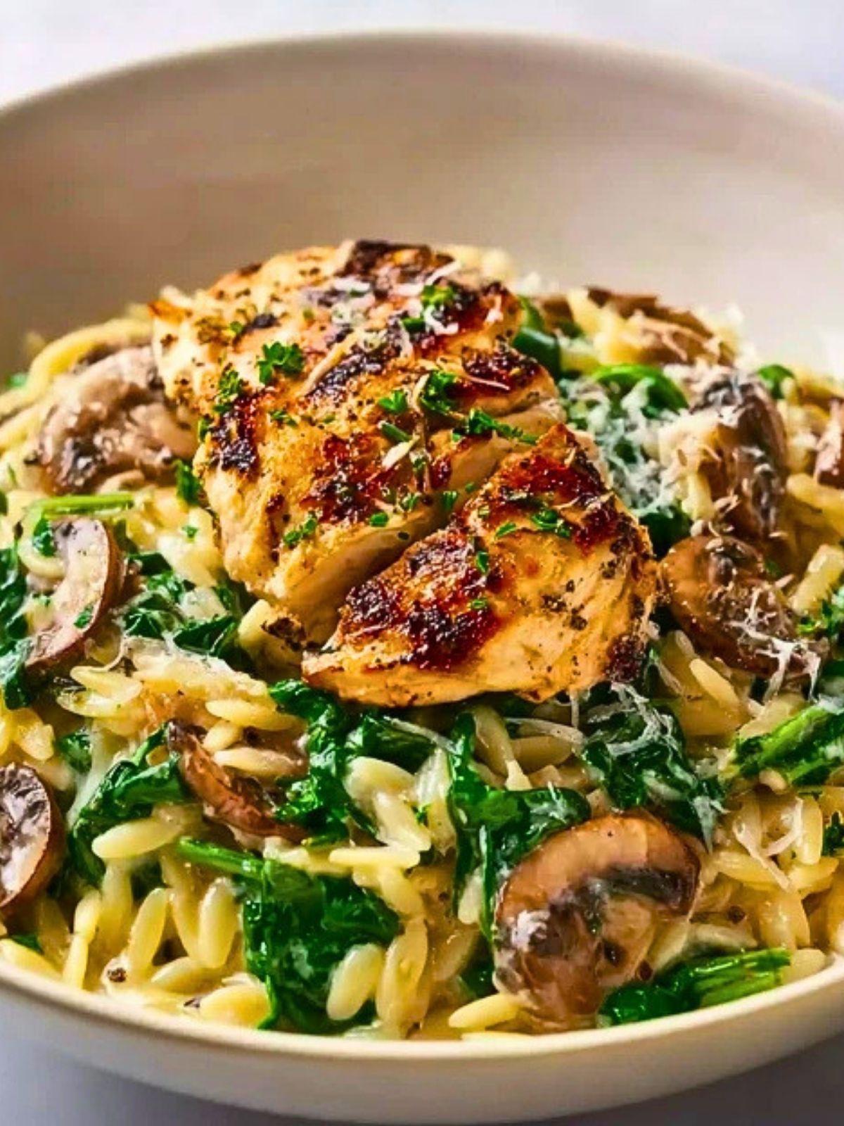 Creamy, comforting, and made in just one pan, this easy dinner recipe is perfect for busy nights when you want something satisfying without the mess. Juicy seared chicken sits on a bed of tender orzo pasta, coated in a rich garlic parmesan cream sauce with mushrooms and fresh spinach. It’s a quick dinner idea that feels restaurant-quality but is simple enough for everyday cooking.