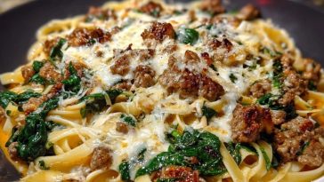 Cheesy Garlic Butter Linguine with Beef, Sausage and Spinach