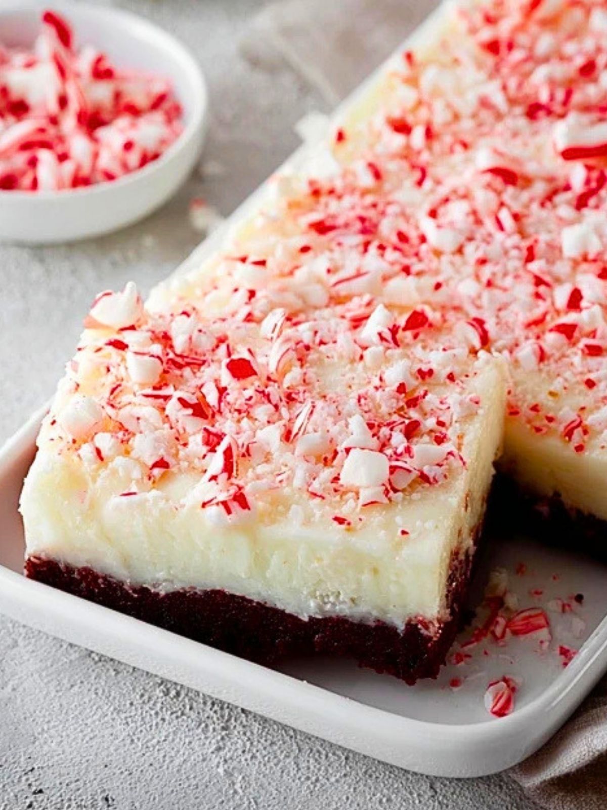 Spread the topping over the chilled cake in an even layer. Sprinkle with crushed candy canes and white chocolate chips if using. Chill again for another hour so everything firms up before slicing.