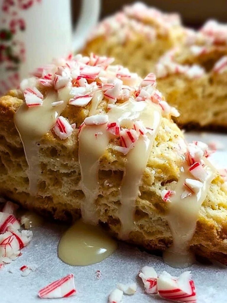 These Peppermint White Chocolate Scones are festive, flaky, and drizzled with vanilla glaze and crushed candy canes. This holiday scone recipe combines buttery layers, white chocolate, and peppermint flavor in a cozy treat perfect for Christmas brunch or winter snacking. Ideal for fans of peppermint desserts and holiday baking ideas.