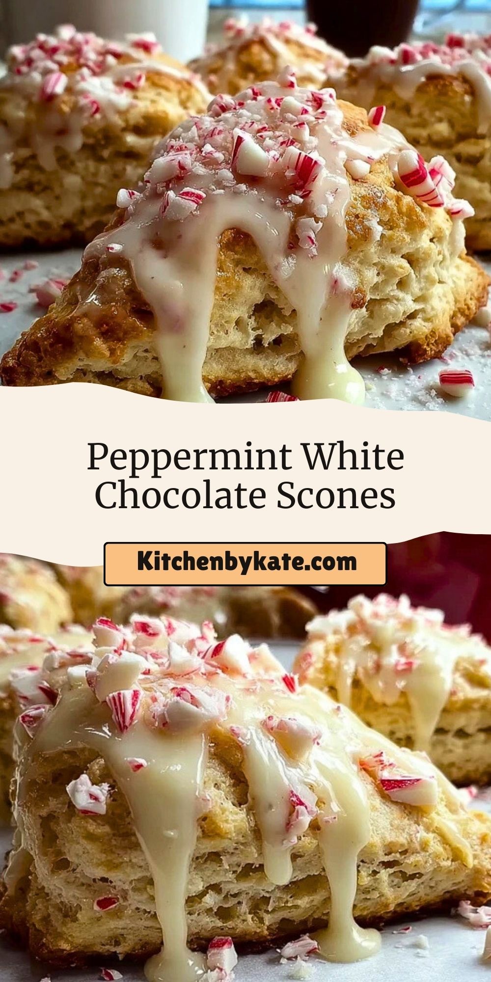 Each bite delivers a dreamy balance: the soft richness of white chocolate mingles with the refreshing crunch of peppermint candy, all nestled within a golden, crumbly scone. Finished with a smooth vanilla glaze and a snowfall of crushed candy canes, they look as magical as they taste.