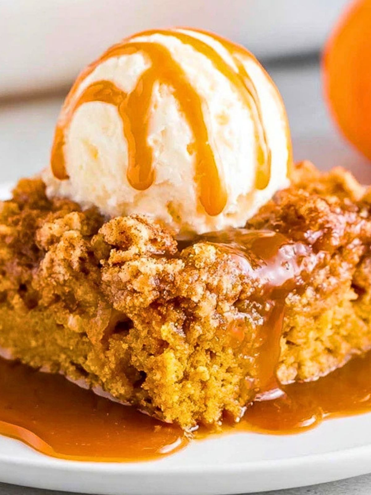 9. Serve warm with whipped cream or vanilla ice cream and a drizzle of caramel sauce.