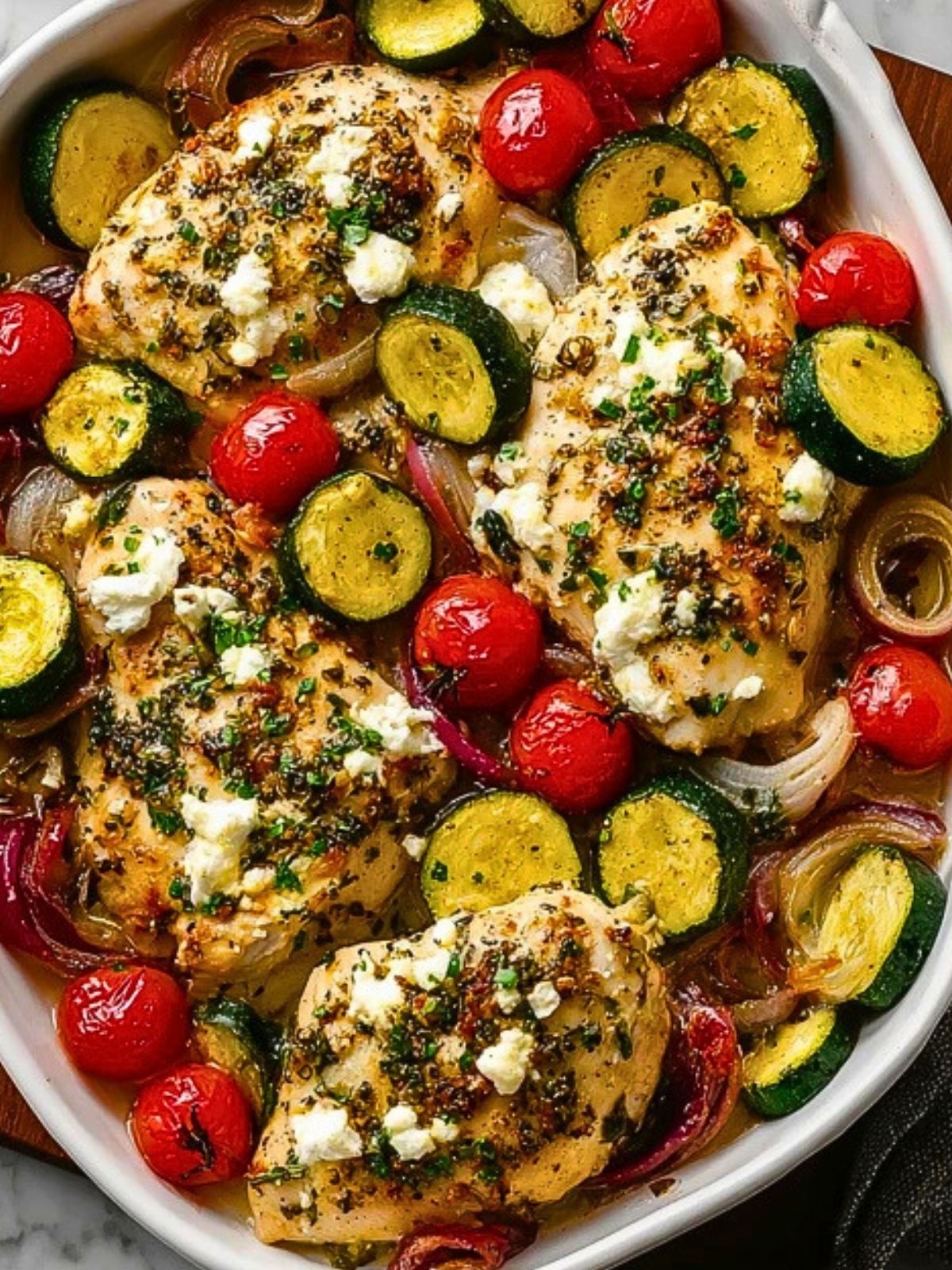 Bake for 25 to 30 minutes, depending on the thickness of the chicken breasts, until the chicken is cooked through and reaches 165°F in the thickest part. The zucchini should be tender, the tomatoes lightly blistered, and the onions soft and golden around the edges.