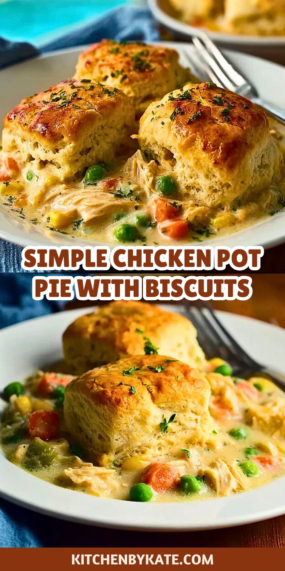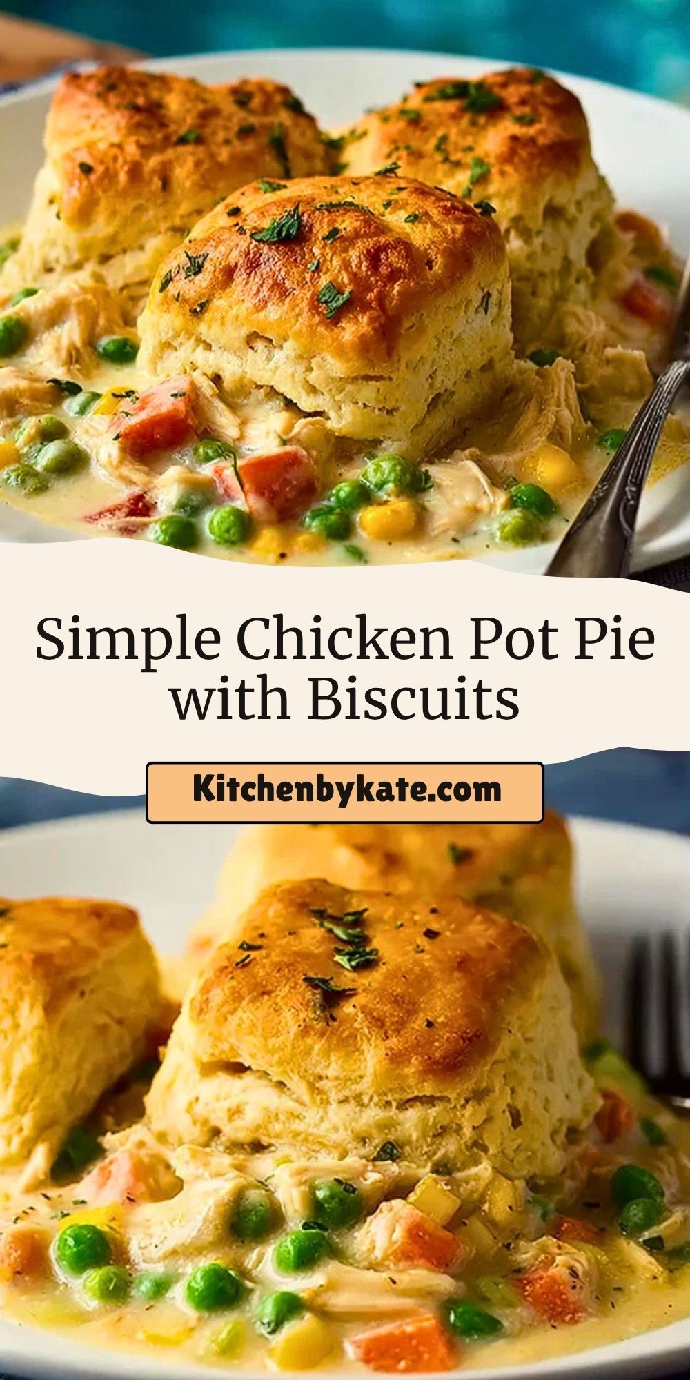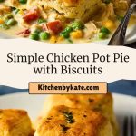 This Simple Chicken Pot Pie with Biscuits is the ultimate comfort food. Creamy chicken and veggie filling topped with fluffy golden biscuits, all baked in one skillet. A cozy, family-friendly recipe perfect for weeknights or weekends. Keywords: chicken pot pie, biscuit topping, comfort food, easy chicken dinner.