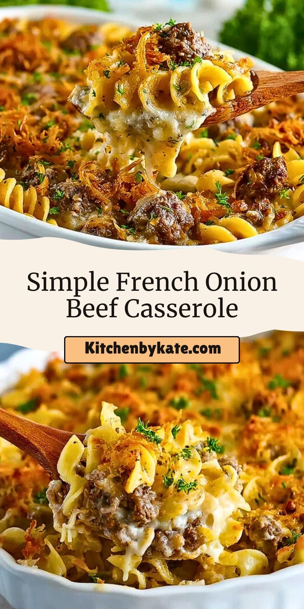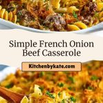 This Simple French Onion Beef Casserole is the ultimate comfort food dinner made with ground beef, egg noodles, French onion soup, and a creamy cheese sauce. Perfect for busy weeknights, potlucks, or freezing ahead—this easy casserole is rich, savory, and family-approved!