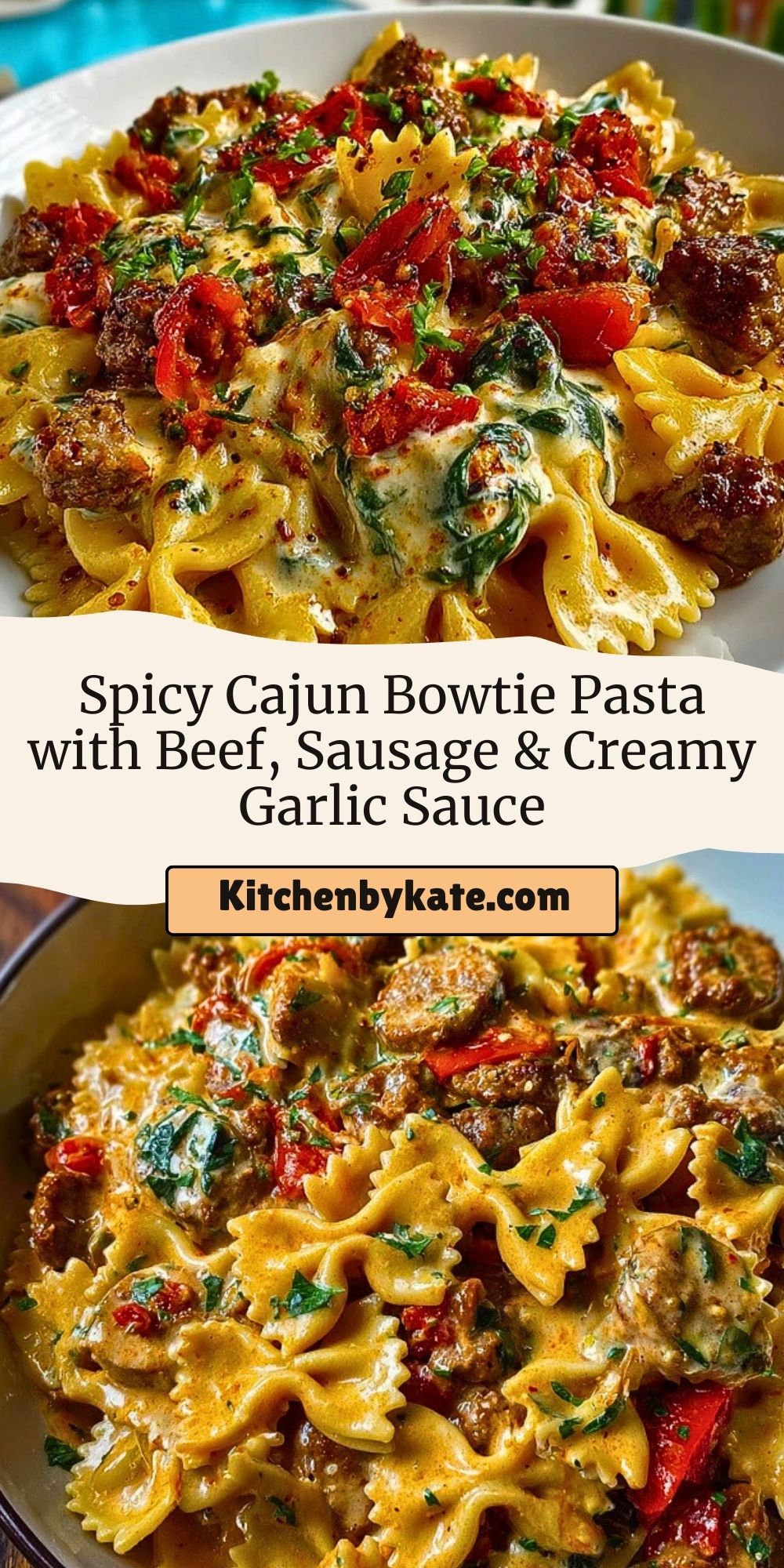Spicy Cajun Bowtie Pasta with Beef, Sausage & Creamy Garlic Sauce