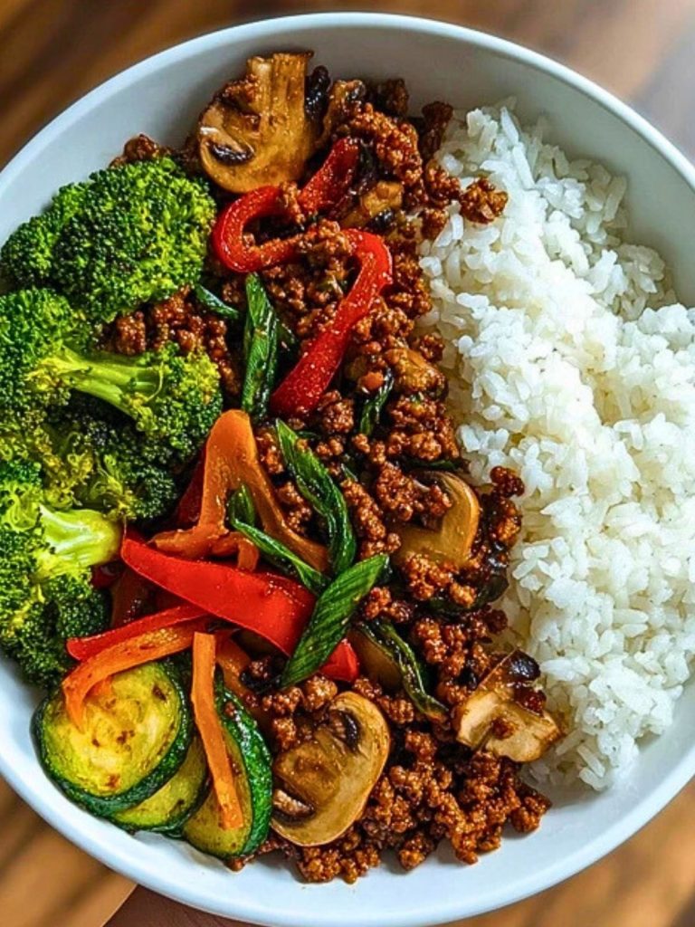 Spicy Ground Beef Stir-Fry Bowl with Garlic Veggies & Steamy Rice
