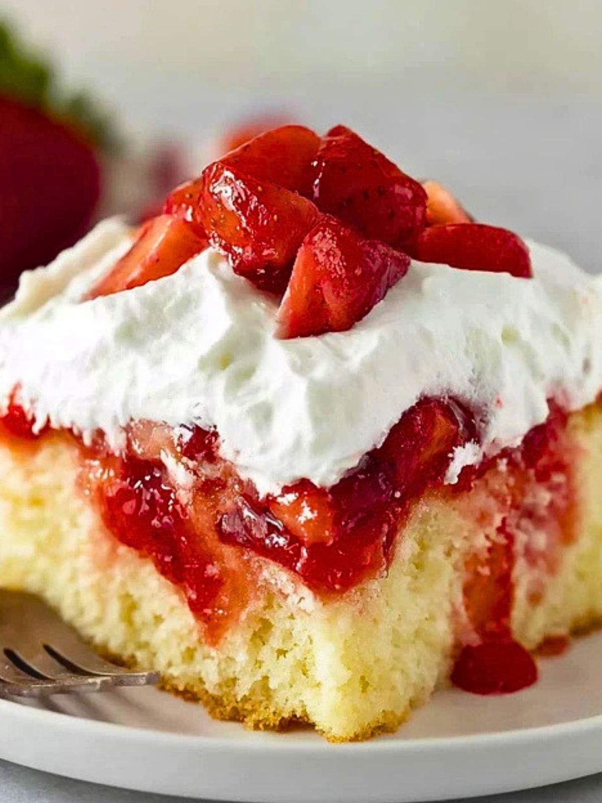 This cake is best served chilled, straight from the refrigerator, when the whipped topping is cool and the strawberry layer is nicely set. For an extra-pretty presentation, top each slice with a few fresh strawberry pieces right before serving. It is perfect for brunch tables, baby showers, summer barbecues, and holiday dessert spreads.