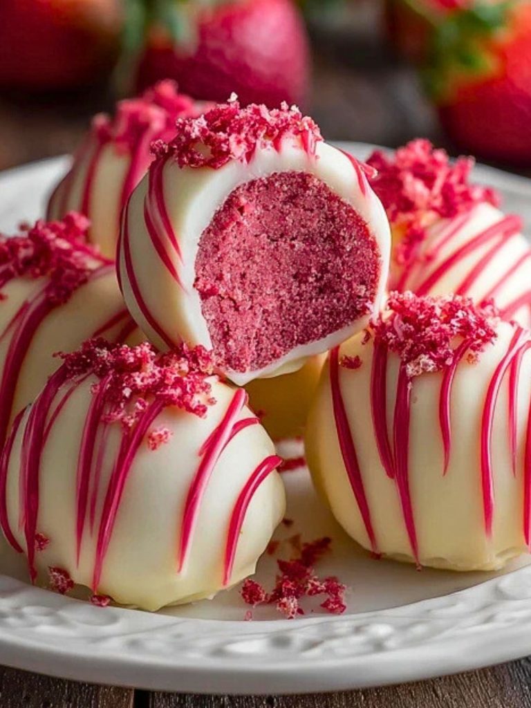 These truffle bites are everything a dessert should be—lush, pretty, and easy to make. You’ll love how the crushed strawberry cake melds with the tangy cream cheese for a filling that’s rich yet light. Dipped in creamy white chocolate and finished with a red drizzle or crushed strawberry crumbs, they look like they belong in a boutique bakery.