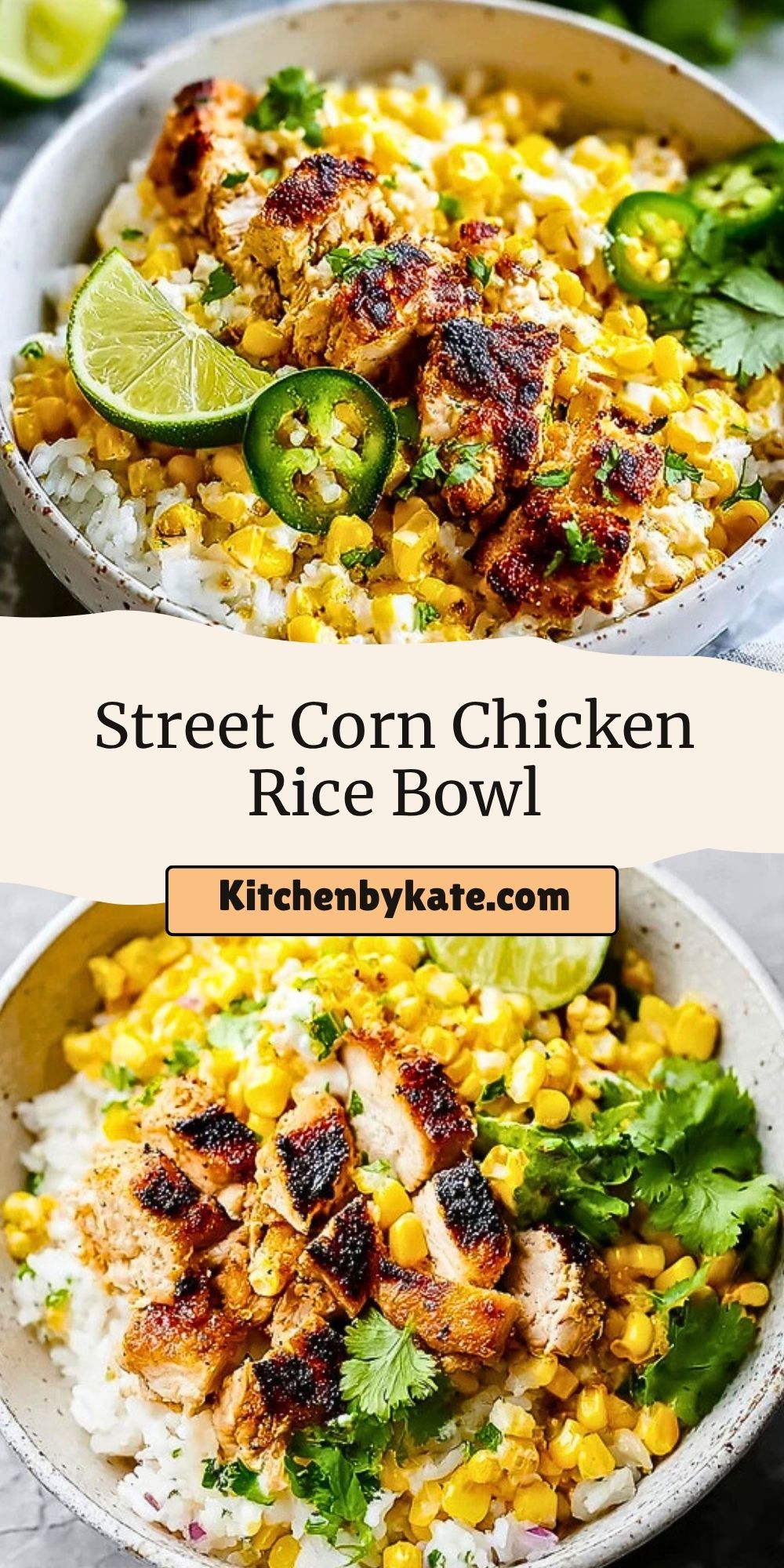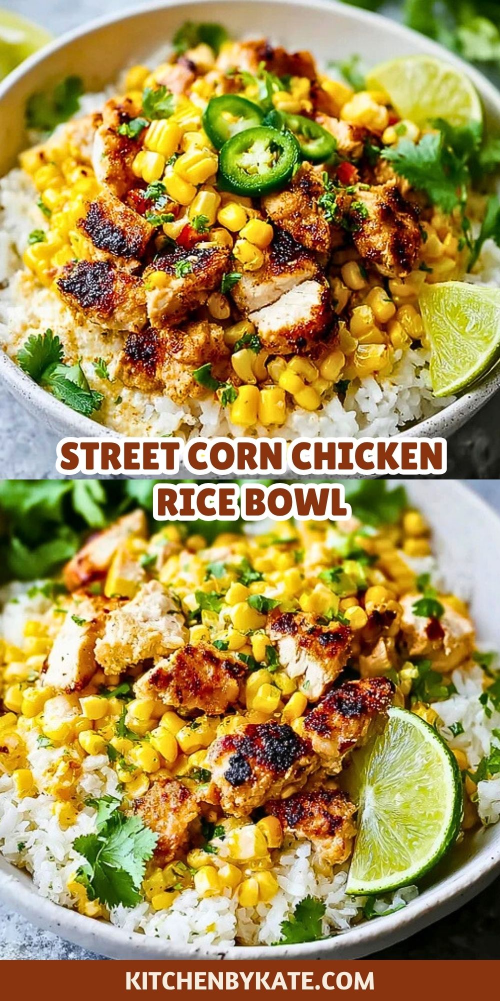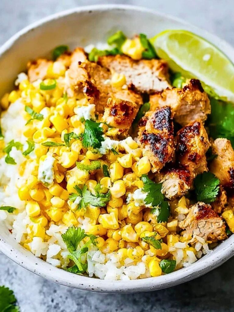 This Street Corn Chicken Rice Bowl is a bold and flavorful meal combining grilled chili-lime chicken, smoky corn, fluffy rice, and a creamy lime sauce. A nourishing, balanced dinner option with protein, fresh herbs, and zest, perfect for weeknight meals or meal prep. Great for lovers of Mexican street food flavors and easy rice bowls.