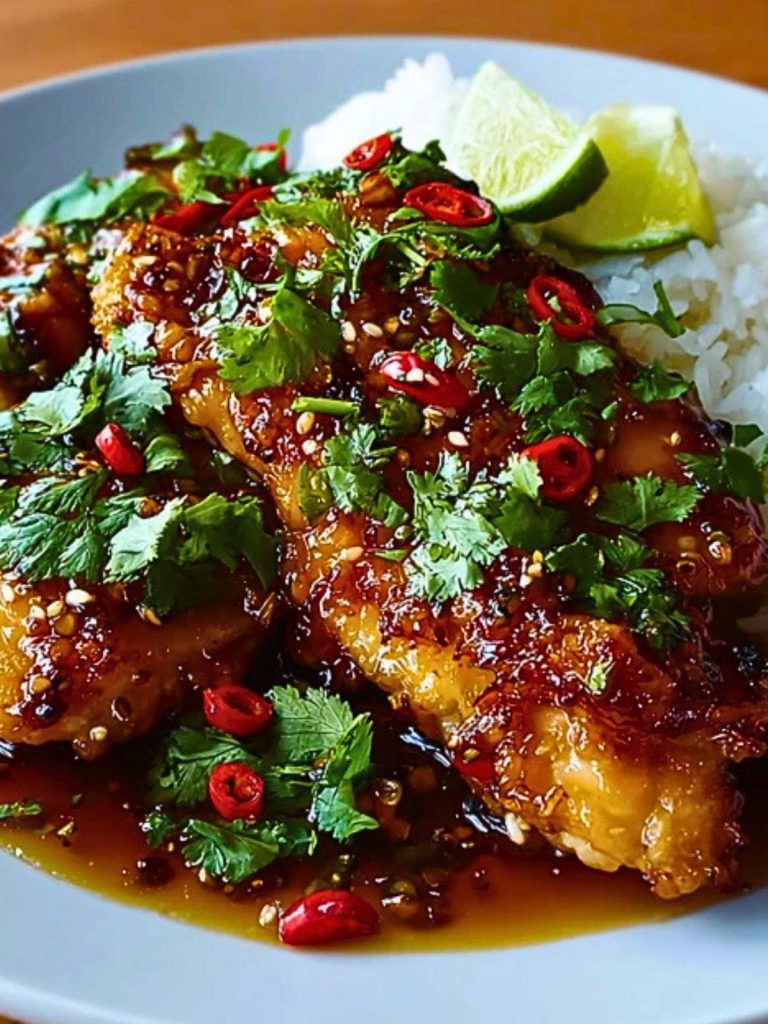 Get ready to meet your new favorite weeknight dinner! This Sweet and Spicy Thai Chicken is a bold, flavor-packed dish that balances sweet, savory, and spicy notes in every bite. Juicy pieces of chicken are pan-fried to golden perfection, then coated in a sticky sauce that’s rich in garlic, honey, soy, and chili heat. Finished with fresh cilantro, red chilies, and a squeeze of lime, this dish sings with contrast and complexity.