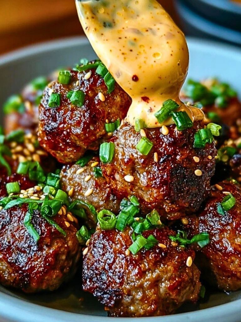 Place glazed meatballs on a serving plate. Drizzle with extra sauce and sprinkle chopped scallions or sesame seeds. Serve with the spicy mayo dip on the side.