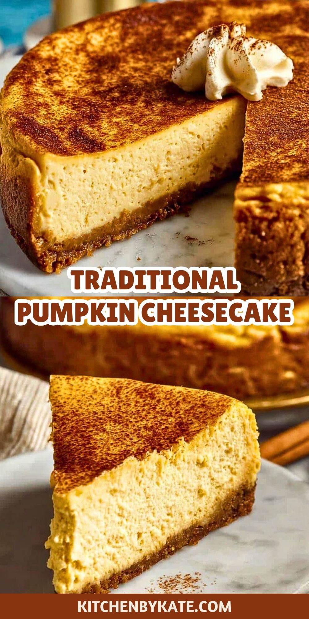 This Traditional Pumpkin Cheesecake is the ultimate fall dessert, combining rich pumpkin puree, warm spices, and creamy cheesecake filling on a buttery graham cracker crust. Perfect for Thanksgiving or any autumn gathering, this make-ahead dessert is cozy, spiced, and crowd-pleasing. A must-try pumpkin dessert recipe for cheesecake lovers.