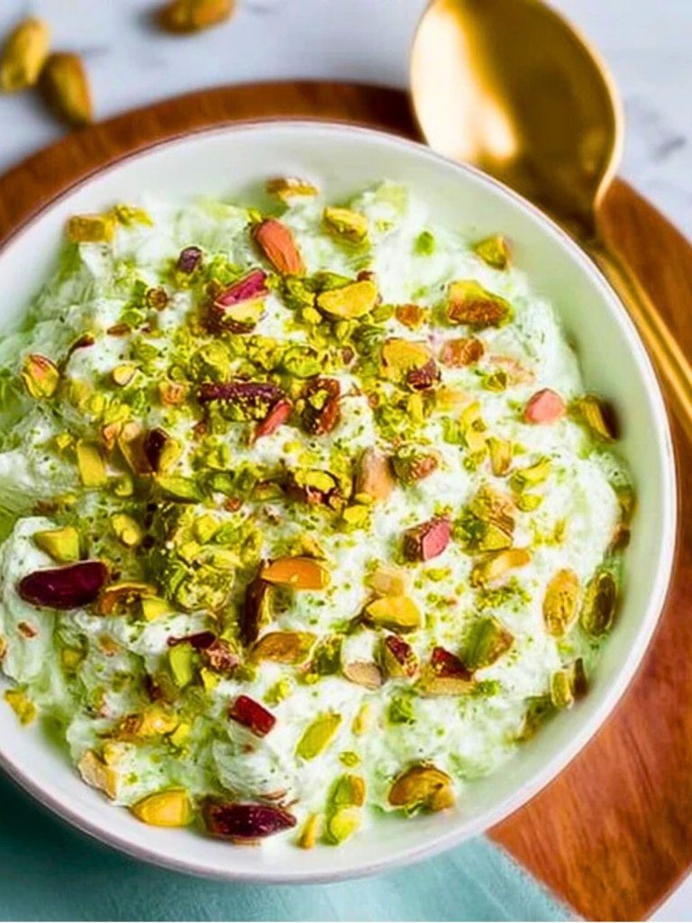 It’s a mix of pistachio pudding mix, crushed pineapple with juice, whipped topping, mini marshmallows, and chopped pistachios. Some versions include cherries or coconut.
