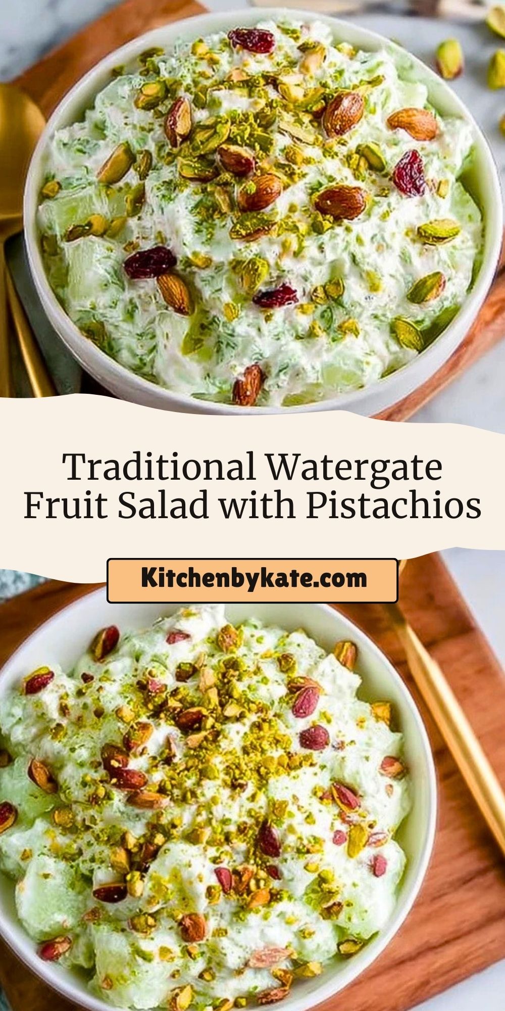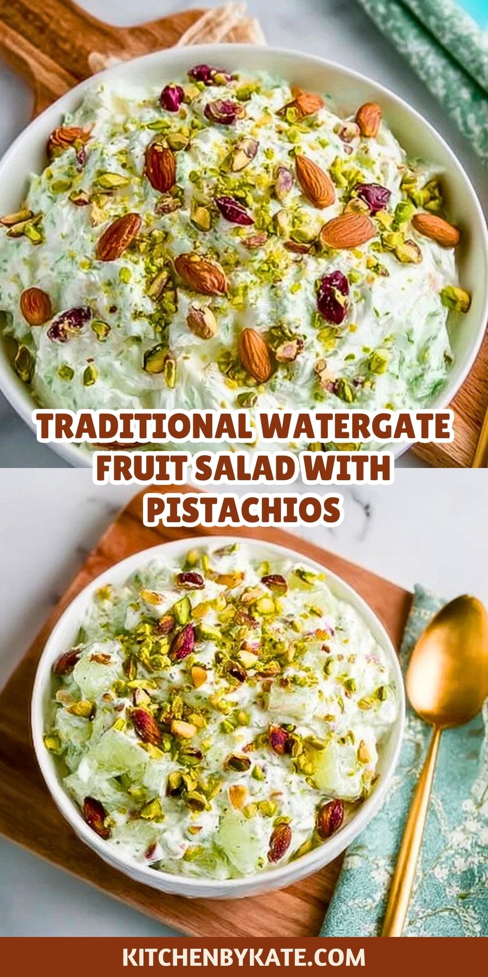 This Traditional Watergate Fruit Salad with Pistachios is a creamy, no-bake dessert made with instant pistachio pudding, whipped topping, crushed pineapple, and mini marshmallows. A classic vintage fruit salad perfect for potlucks, picnics, and holidays—easy, fluffy, and full of nostalgic flavor!